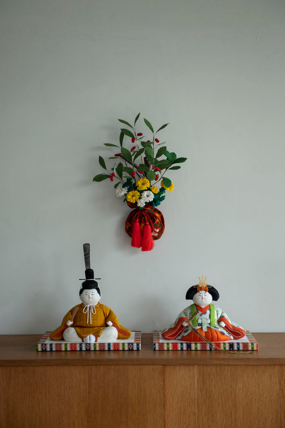 五色の木目込み人形は、頭部・胴体・衣裳という三つの要素が積み重なり、一体のお人形として完成します。
