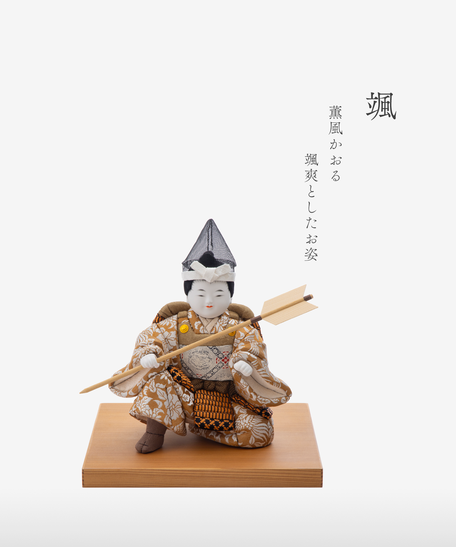 小さな机や玄関などにもお飾りできる、コンパクトな五月人形です。弓矢を手にまさに大事な場へと臨むその姿勢は、男の子らしく凛とした空気をまといます。しかし厳か一方ではないく、五色・原孝洲独特のお顔立ちによ