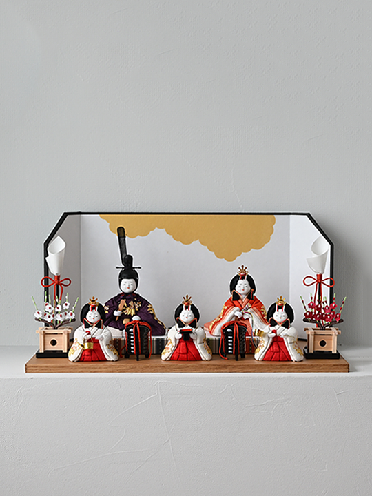 お殿様とお姫様の親王飾りに三人官女を加えた飾りです。五人のお飾りになり、ぐっと華やかになります。