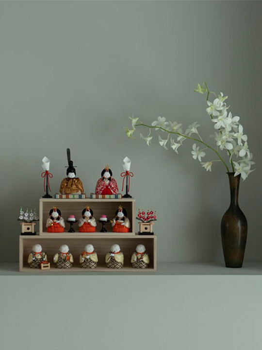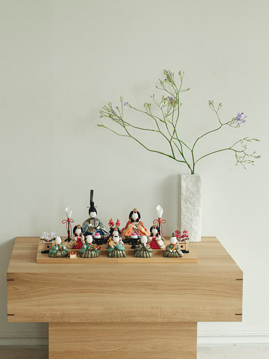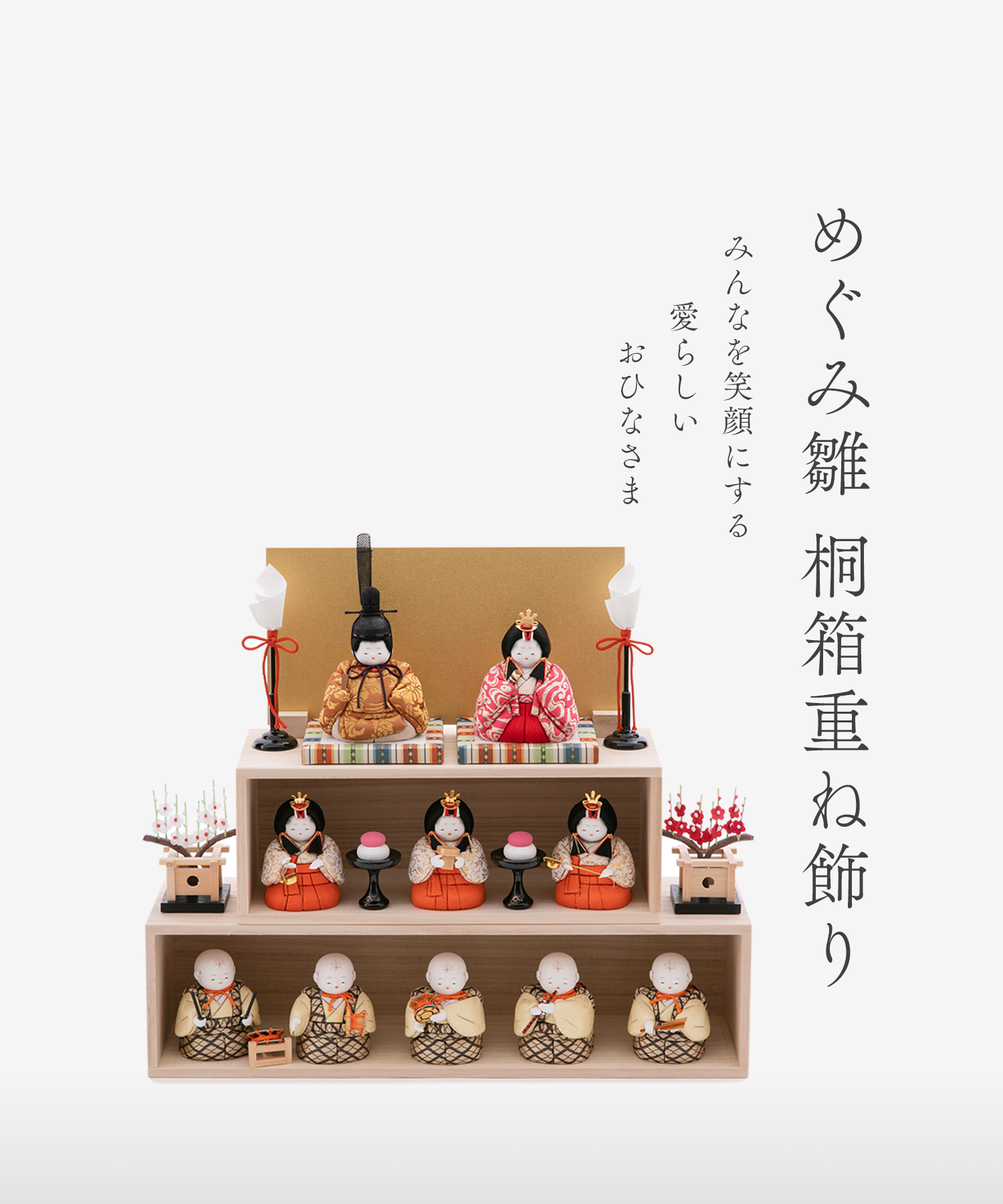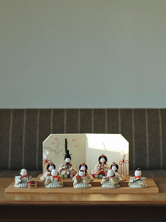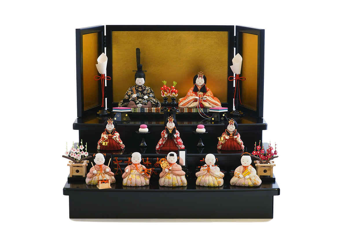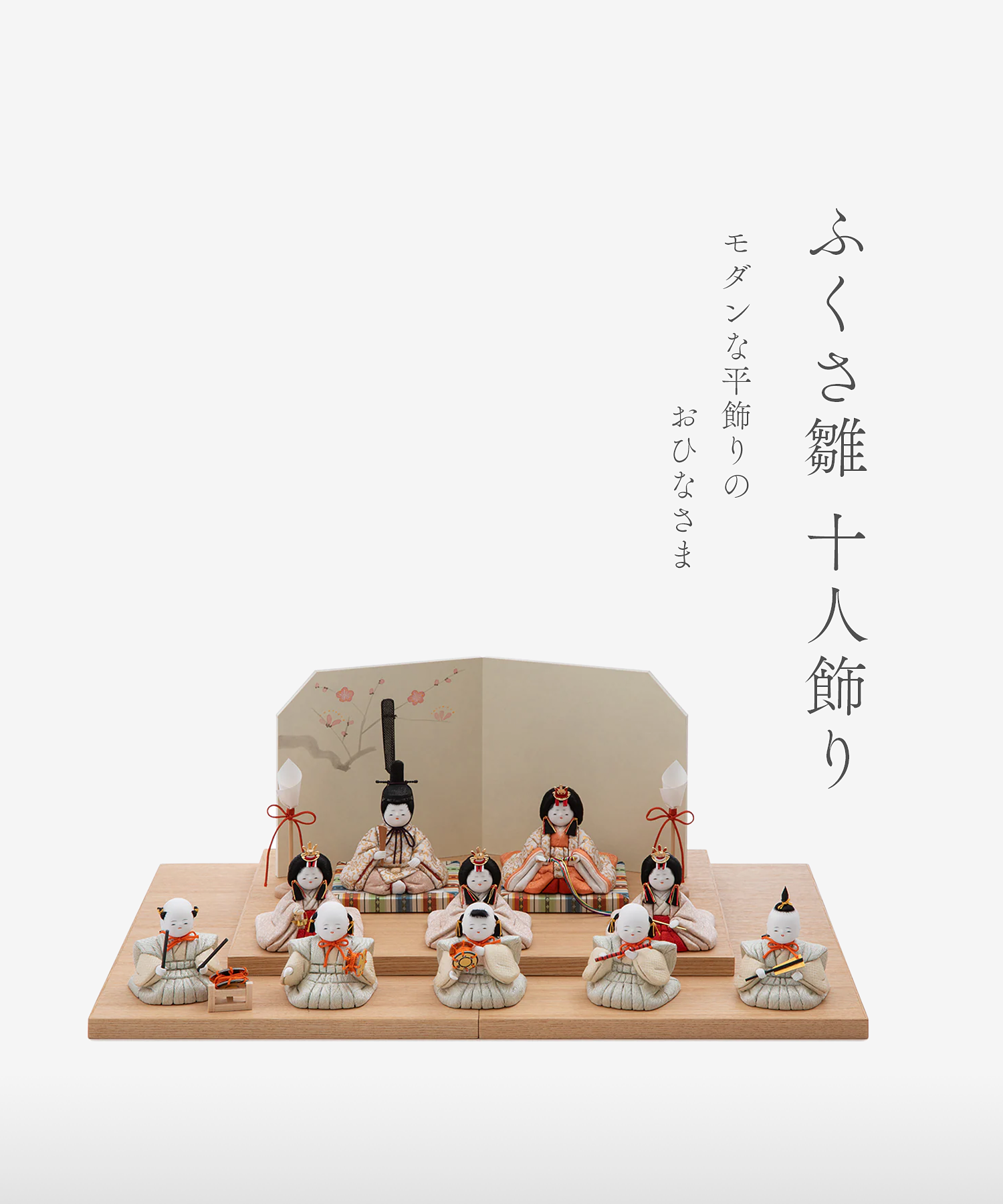 人気のある「花香雛」と同じ丸いボディに、ぽっちゃりとしたおぼこ顔の十人飾りのお雛さま。暖かな色合いのお衣装を身にまとい、かわいらしくあどけないお顔のお人形たちが、お節句のお祝いに彩りを添えます。組み立