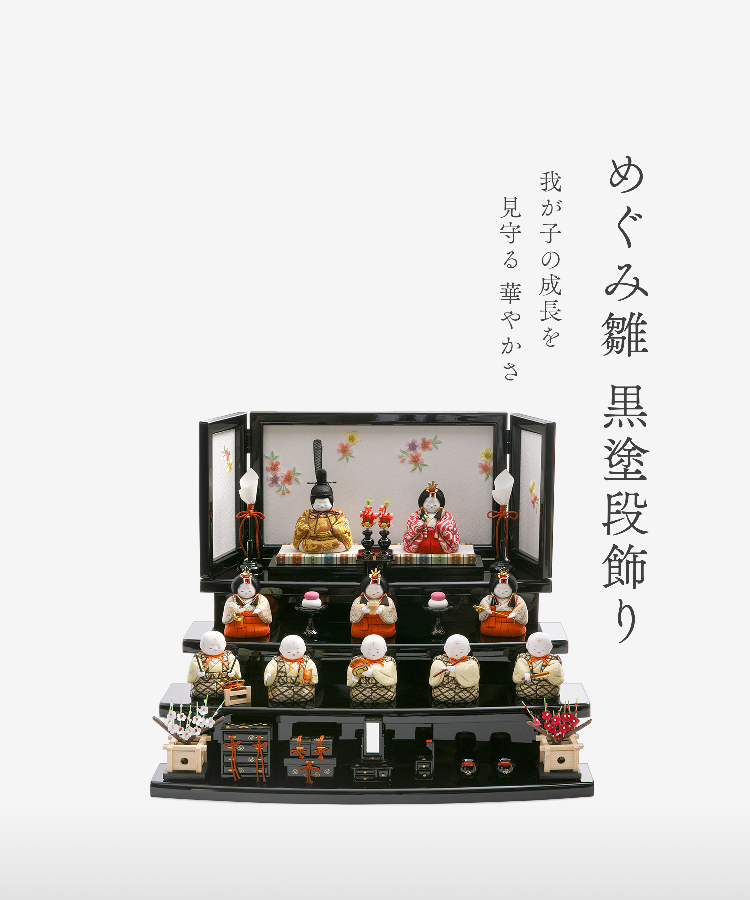 生まれたばかりの赤ちゃんをイメージさせる小さくて丸々としたフォルムで、三人官女・五人囃子まで揃った、木目込み人形ならではの雛人形です。こちらの雛人形の最大の特徴は、飾る場所の奥行を気にせずに楽しめるこ