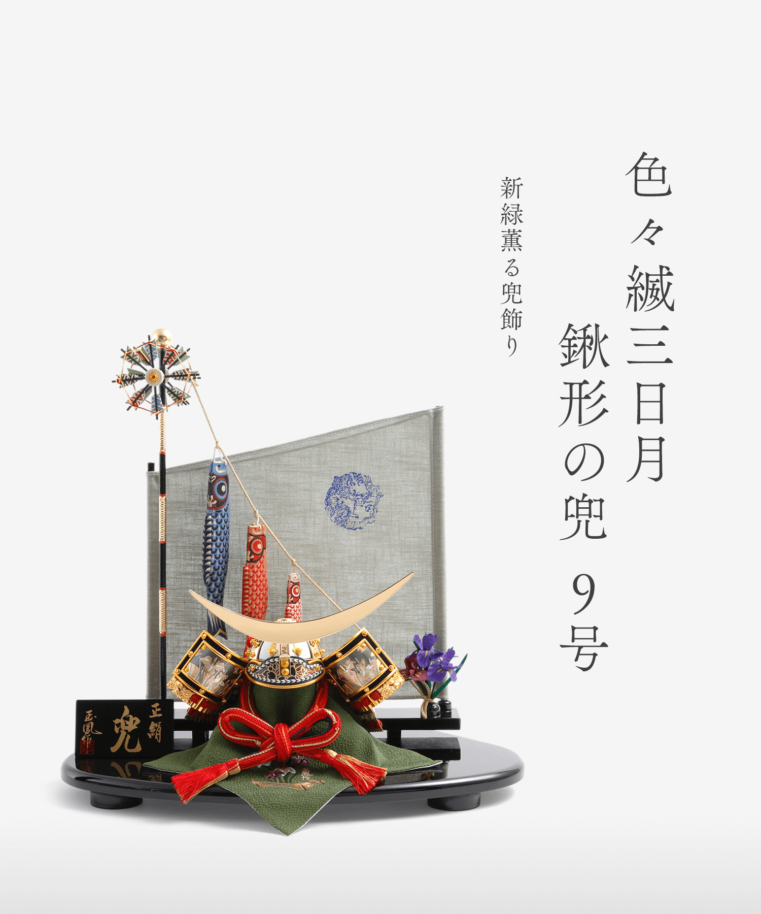 ※作札付きます。兜本体寸法:幅25×奥行15×高さ19cmコンパクトサイズを代表する兜飾りです。五月飾りらしく、こちらの兜飾りからは新緑の薫りがたちこめてくるような素敵なお飾りです。メインの兜の正面に