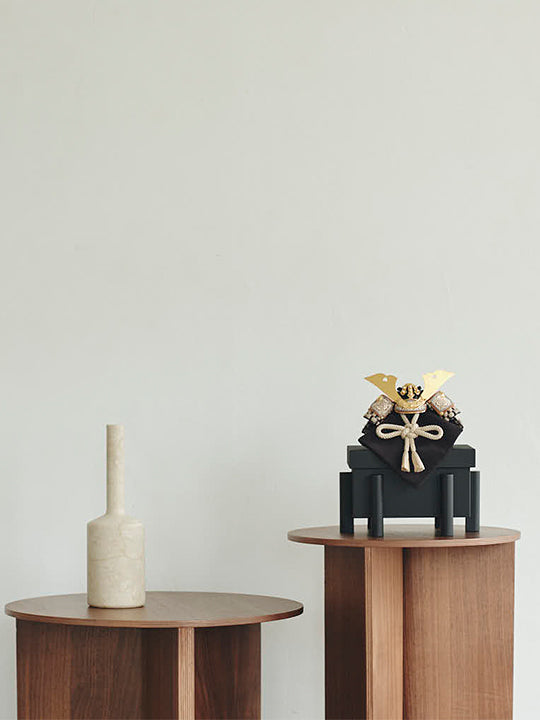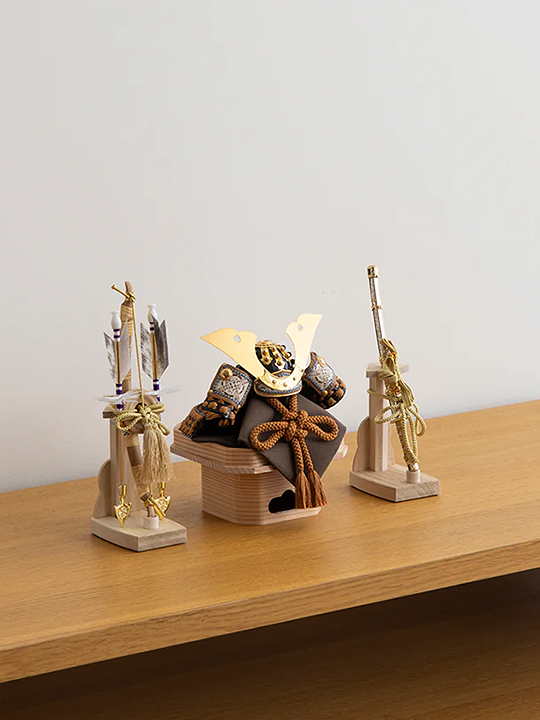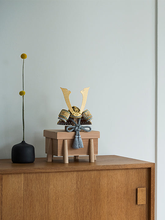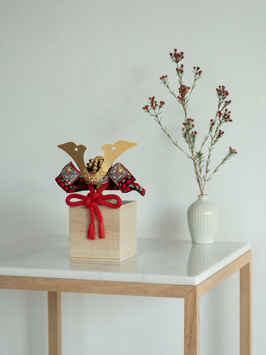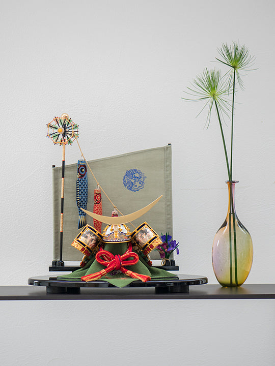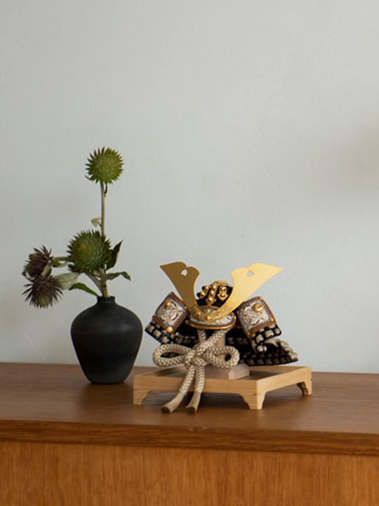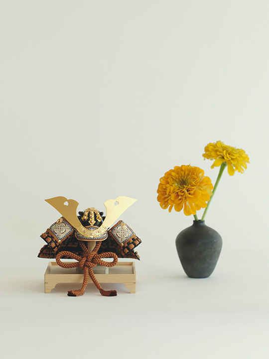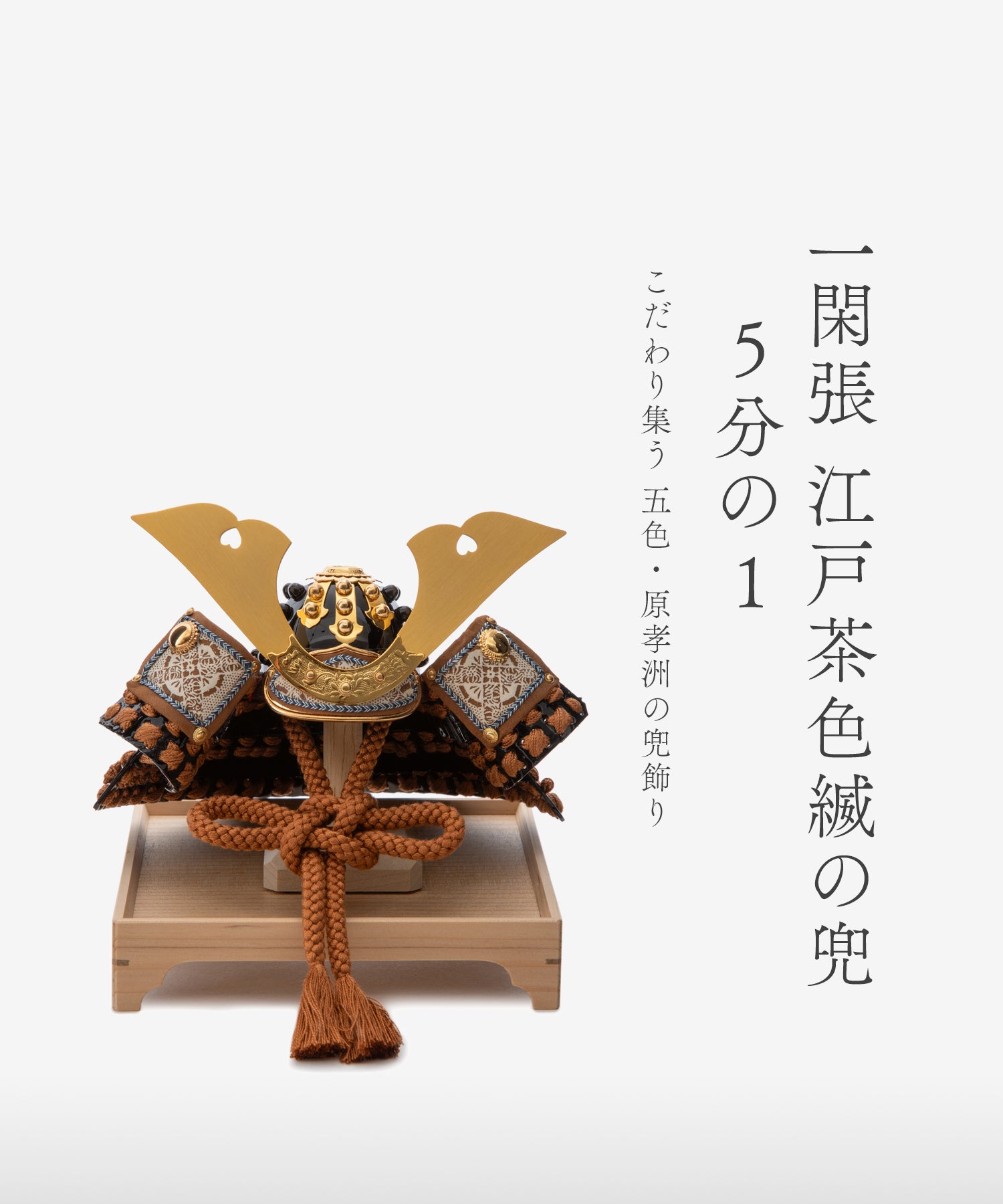 小さな机や玄関にもおしゃれに飾れる、五月人形では類を見ないコンパクトな兜飾りです。こちらは五色オリジナルの人気兜です。良き伝統を受け継ぎながら、現代の居住空間に合わせての創作を試みる五色・原孝洲の原裕