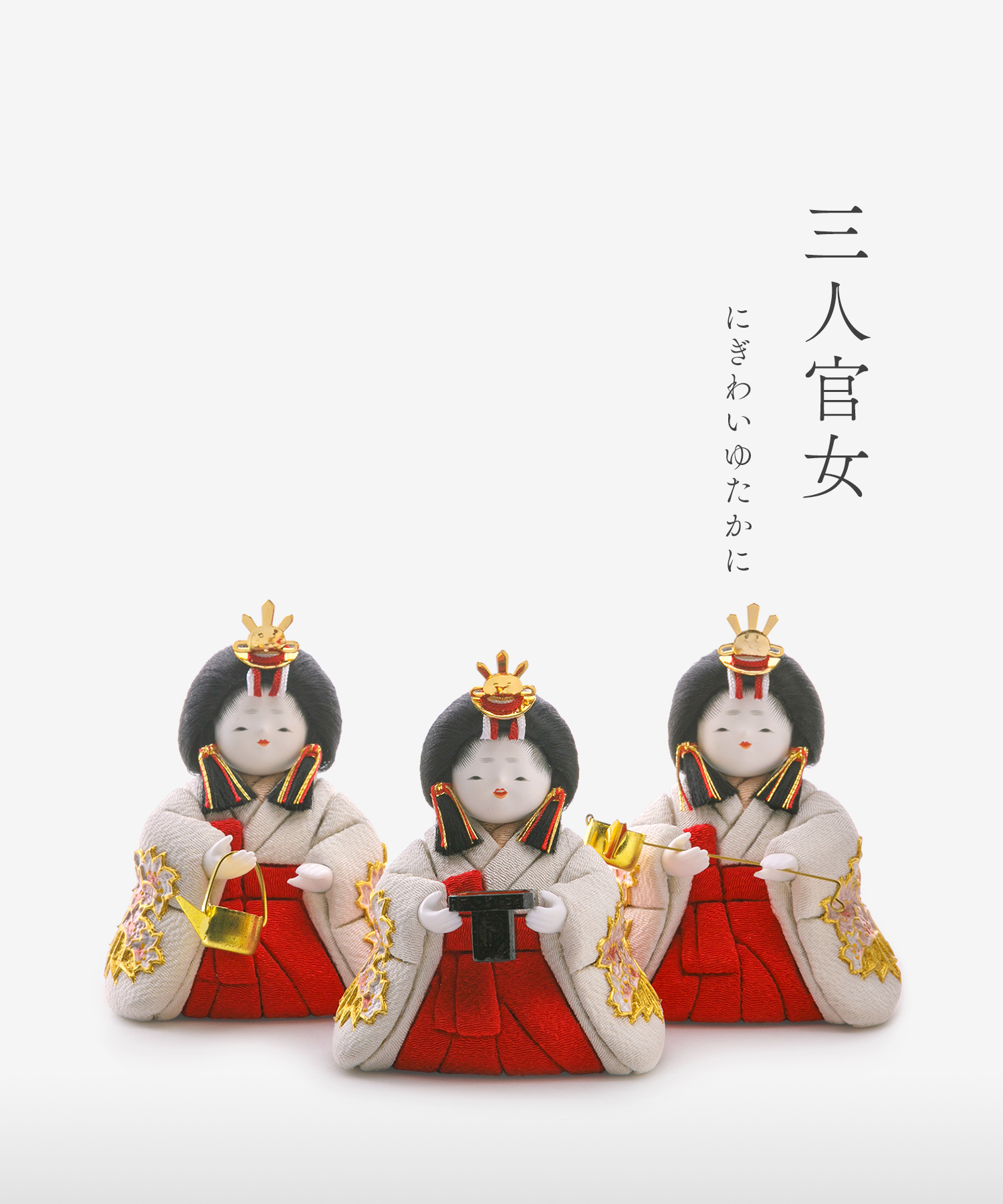 お殿さまとお姫さまのふたり飾り(親王飾り)に加えて頂く三人官女のお人形です。愛らしい表情の中に、親王様へお仕えし、見護るにふさわしい慈愛が満ちています。三人の方々は独特のお道具を携えます。向かって右は