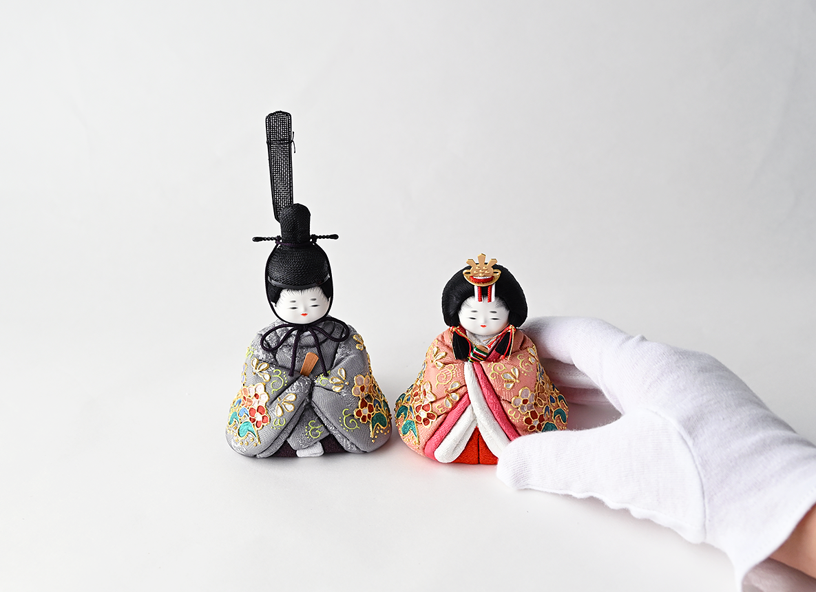 飾り台やお屏風が選べる、コンパクトシリーズの雛人形です。純真無垢な赤ちゃんをイメージさせる小さくて丸々としたフォルムに、両袖を合わせた愛らしいお姿は木目込み人形ならではのスタイルです。 小ぶりでも本格の作り。例えばふんわりと空気をまとう技術となめらかな絹糸を使用した髪型は、美しくも可憐なお雛様をより一層引き立たせます。かわいらしさのなかに上品さをも秘めた手描きのお顔が人気です。蒔絵のお衣装は2種類ご用意。優しくほほえむ姿を前にくつろぐ気分は、桃の節句を一段と華やかにすることでしょう。