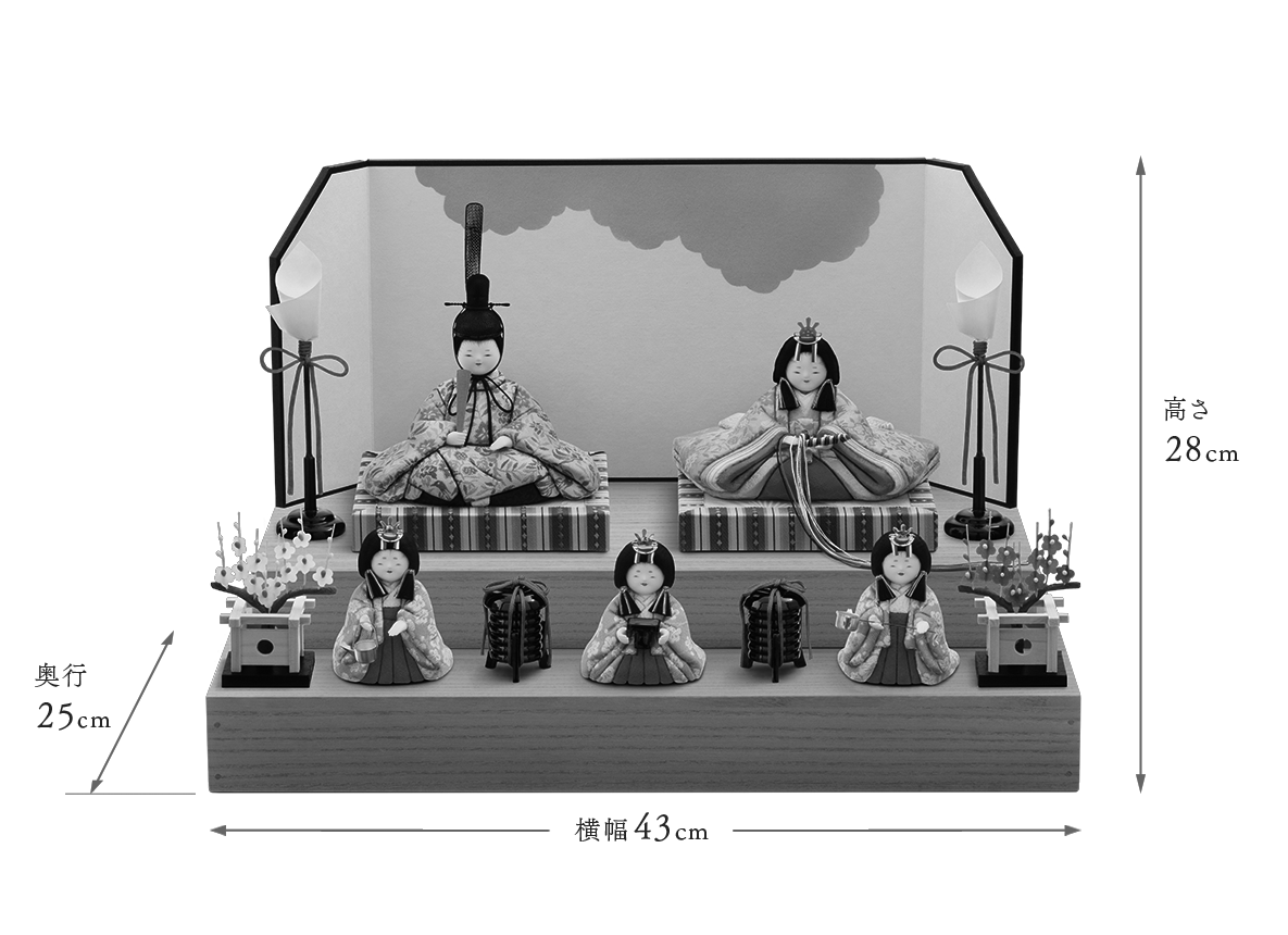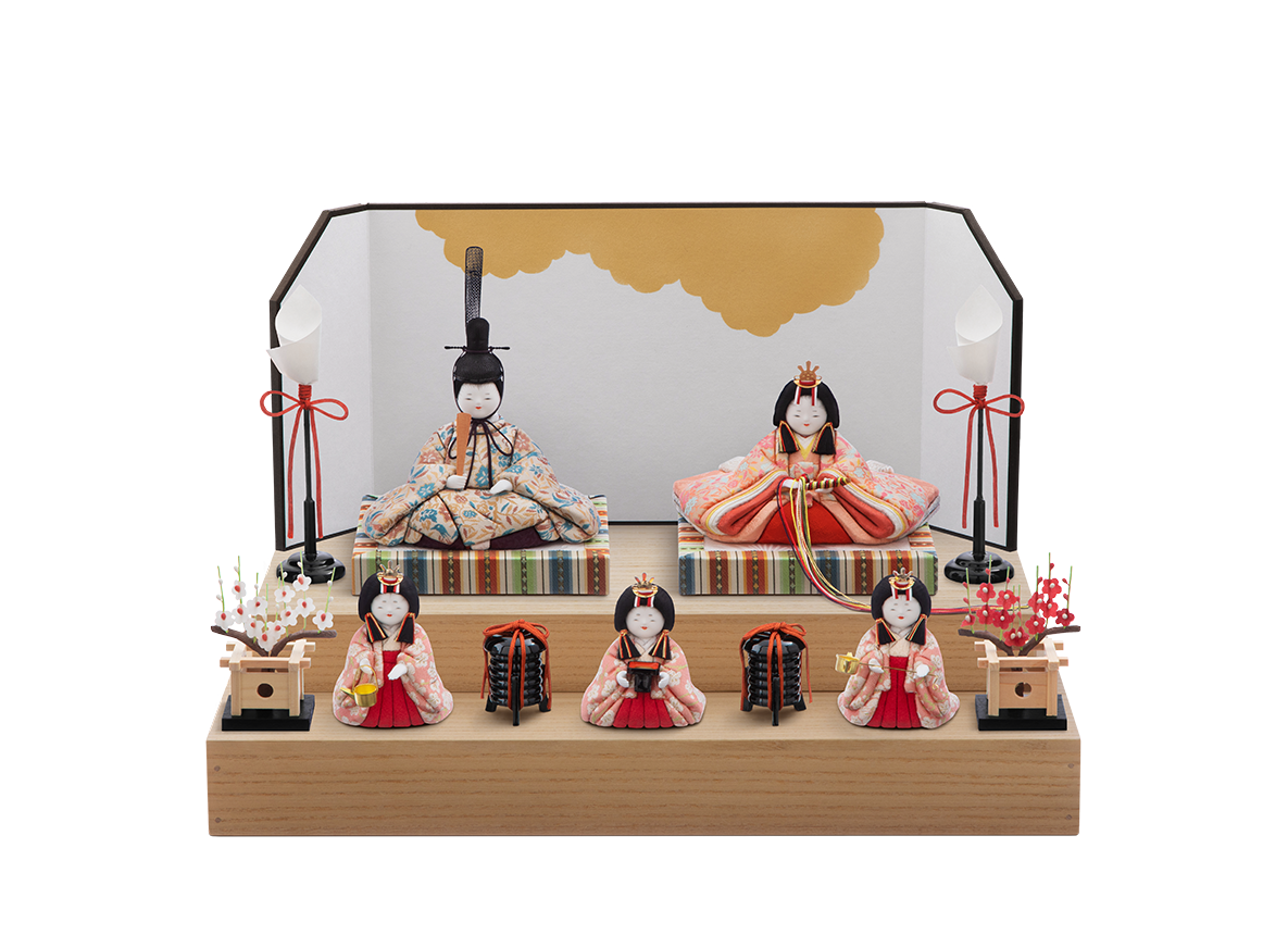 【金襴】飾り台やお屏風が選べる、コンパクトで飾りやすいHINAシリーズの雛人形です。お衣装の美しさや体の流れるような造形の美しさに見惚れてしまう五色・原孝洲の自信作で、三代続く木目込み人形作家の技術に裏打ちされた雛人形です。まず、体の造形の繊細さに魅力がつまっています。肩口から袂(たもと)、背中にかけて美しい曲線を描いており、写実味を得ながらも、それでいてどこかにお人形さんらしい丸みを帯び、絶妙なバランスが愛くるしさを生んでいます。お姫様の十二単を着重ねた際の、袖口と後背部の美しいグラデーションも見逃せません。同様にお殿様も後背部に下襲の裾(したがさねのきょ)と呼ばれる部分まで再現し伝統に則りながら、かつ、足を組んだ形などはかわいらしく、味わい深い作品になりました。お顔も体とのバランスに合わせ、上品で麗しい、しかしどこかに幼さを残した、五色・原孝洲独特であり、大切にしているお姿です。ふんわりと空気をまとったように贅沢に結われた髪型は、多くの絹糸を丁寧にまとめあげて仕上げており、額の生え際まで筆で丁寧に描きこむことで、特徴あるお顔がもつ優美さを引き立てます。お衣装はツヤを含んだ美しい西陣織で、貴人にふさわしい花鳥文様を殿姫へ仲睦まじく着せつけました。殿姫同様に、お子様の行く末頼もしい成長を見守る三人官女は、雛人形の華やかでいながら厳かな味わいを豊かにします。かわいいだけでは終わらない、伝えるべき大切な日本文化の美しさをこの場へ現出させてくれます。雛人形として欠かすことのできない三人官女も私たちのこだわりです。飾り方は段飾り上段に殿姫を、下段へ三人官女を並べます。段のお飾りにすることで立体的な美が強調されながらも、台の幅や奥行きがほぼ変わらない点も大変人気です。【蒔絵】こちらの作品は特にお衣装の出来栄えに目を惹かれます。豪華にも本金箔を使い、蒔絵の技法(手描きで衣装の上から直接描く)で絵柄を施しました。桃の節句の春らしい気分が嬉しい梅と、繁栄を示す松や竹の縁起柄をお衣装いっぱいに盛り込みました。お子様の門出に良い縁起をたくさん取り込んだ絵柄となっています。ご家族で集うお節句のお祝いにはきっとお雛様に注目が集まるはずです。