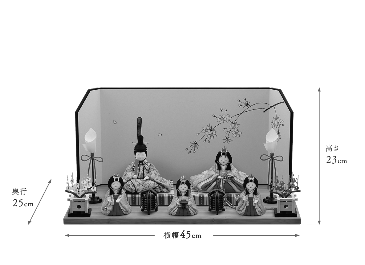 【金襴】飾り台やお屏風が選べる、コンパクトで飾りやすいHINAシリーズの雛人形です。お衣装の美しさや体の流れるような造形の美しさに見惚れてしまう五色・原孝洲の自信作で、三代続く木目込み人形作家の技術に裏打ちされた雛人形です。まず、体の造形の繊細さに魅力がつまっています。肩口から袂(たもと)、背中にかけて美しい曲線を描いており、写実味を得ながらも、それでいてどこかにお人形さんらしい丸みを帯び、絶妙なバランスが愛くるしさを生んでいます。お姫様の十二単を着重ねた際の、袖口と後背部の美しいグラデーションも見逃せません。同様にお殿様も後背部に下襲の裾(したがさねのきょ)と呼ばれる部分まで再現し伝統に則りながら、かつ、足を組んだ形などはかわいらしく、味わい深い作品になりました。お顔も体とのバランスに合わせ、上品で麗しい、しかしどこかに幼さを残した、五色・原孝洲独特であり、大切にしているお姿です。ふんわりと空気をまとったように贅沢に結われた髪型は、多くの絹糸を丁寧にまとめあげて仕上げており、額の生え際まで筆で丁寧に描きこむことで、特徴あるお顔がもつ優美さを引き立てます。お衣装はツヤを含んだ美しい西陣織で、貴人にふさわしい花鳥文様を殿姫へ仲睦まじく着せつけました。殿姫同様に、お子様の行く末頼もしい成長を見守る三人官女は、雛人形の華やかでいながら厳かな味わいを豊かにします。かわいいだけでは終わらない、伝えるべき大切な日本文化の美しさをこの場へ現出させてくれます。雛人形として欠かすことのできない三人官女も私たちのこだわりです。収納にも困らないと好評の、組み立て不要の軽くて薄い平らな台に屏風をのせてお飾りするセットです。まさにハレの日にふさわしい雛人形です。【蒔絵】こちらの作品は特にお衣装の出来栄えに目を惹かれます。豪華にも本金箔を使い、蒔絵の技法(手描きで衣装の上から直接描く)で絵柄を施しました。桃の節句の春らしい気分が嬉しい梅と、繁栄を示す松や竹の縁起柄をお衣装いっぱいに盛り込みました。お子様の門出に良い縁起をたくさん取り込んだ絵柄となっています。ご家族で集うお節句のお祝いにはきっとお雛様に注目が集まるはずです。