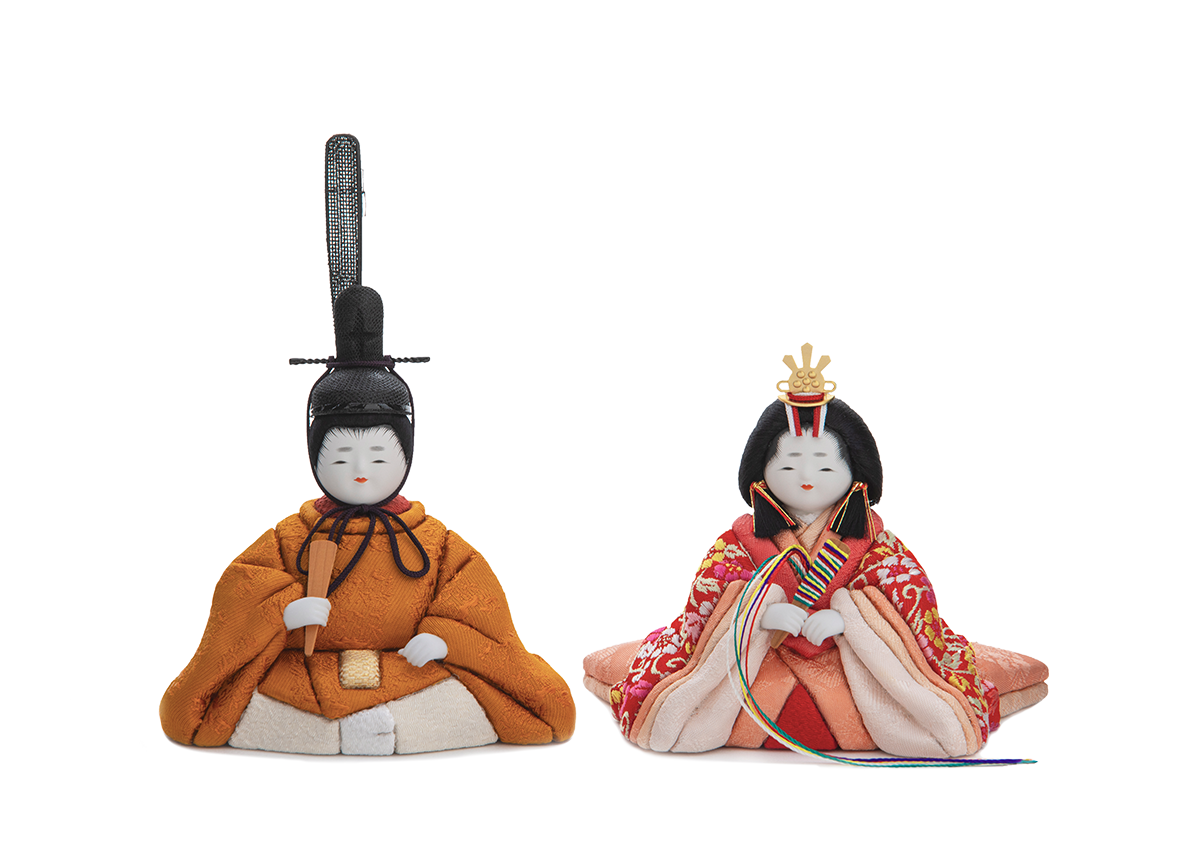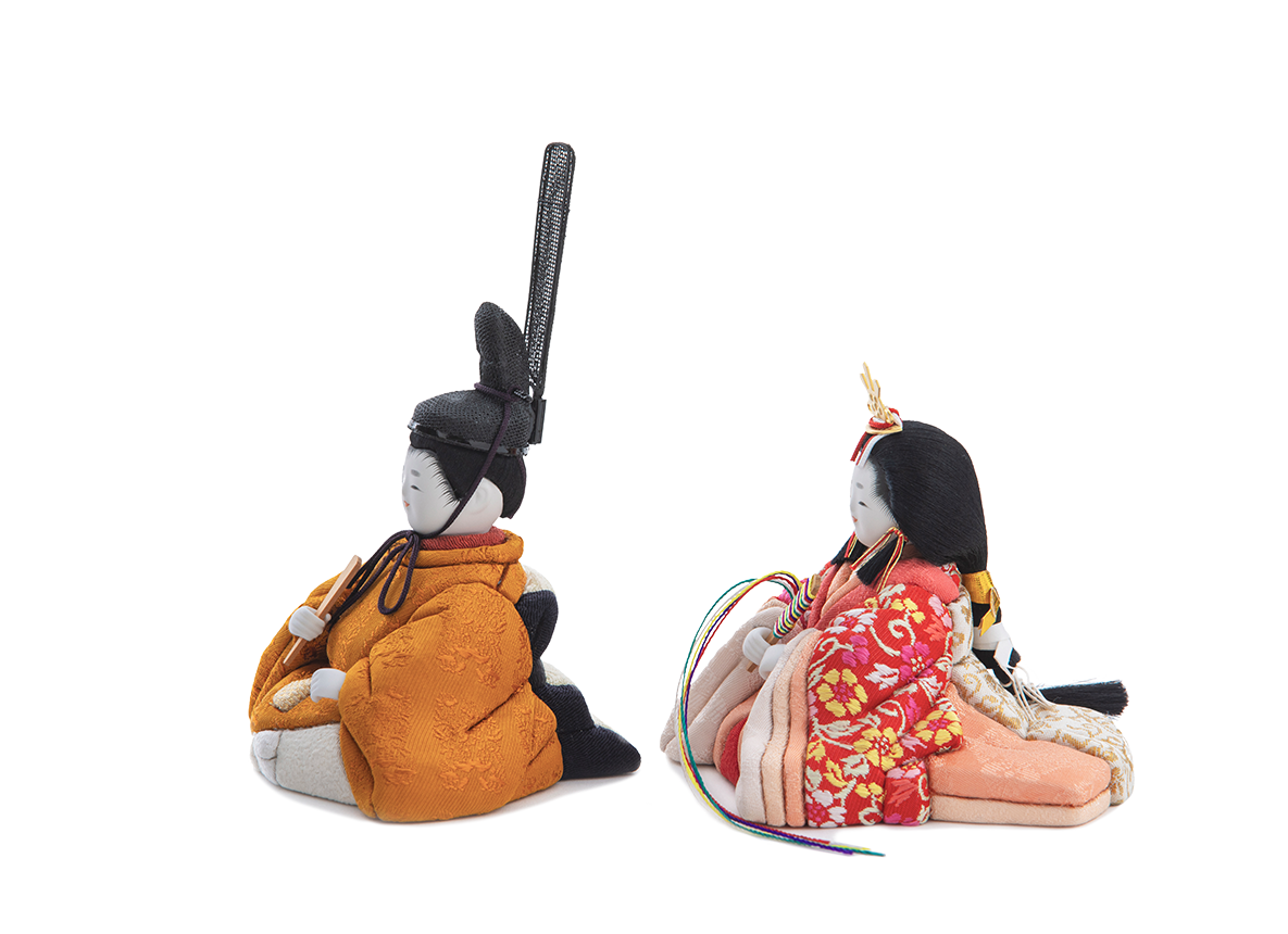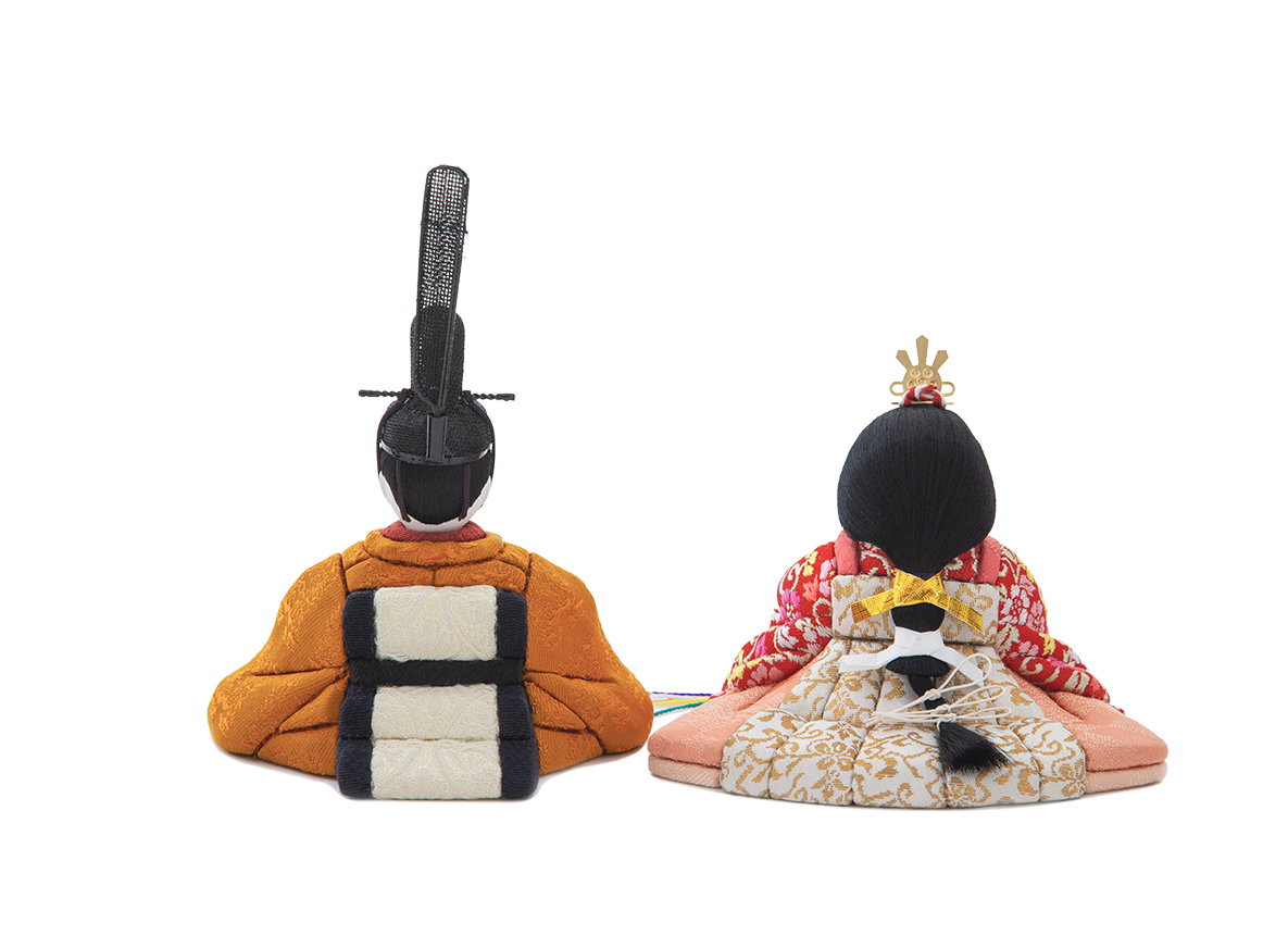 飾り台やお屏風が選べる、コンパクトシリーズです。ほほえみをたたえた表情は赤ちゃんのもつ純真無垢な姿、また成長した上品な雰囲気をもただよわせており、これこそが五色・原孝洲の大切にする雛人形です。ふんわりと空気をまとったように贅沢に結われた髪型は、多くの絹糸を丁寧にまとめあげて仕上げており、額の生え際まで筆で丁寧に描きこむことで、特徴あるお顔がもつ優美さを引き立てます。お殿様の後背部には下襲の裾(したがさねのきょ)と呼ばれる部分まで再現しており、着物を召したお姿は、木目込み人形としての高い技術を示しています。お衣装は3種類のご用意。