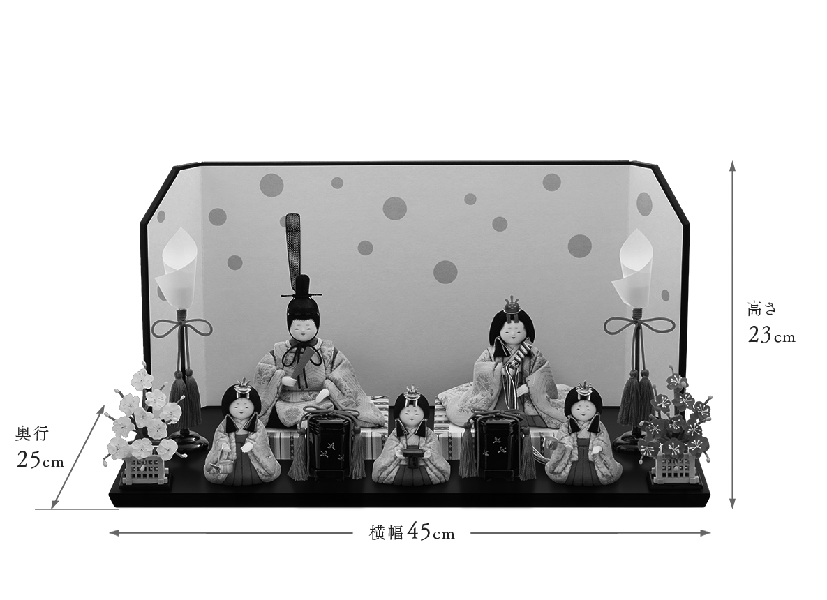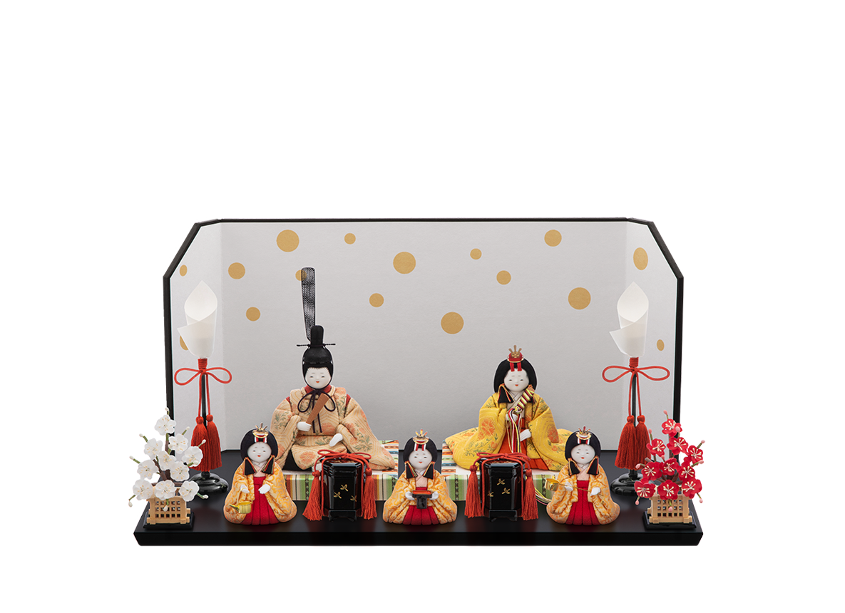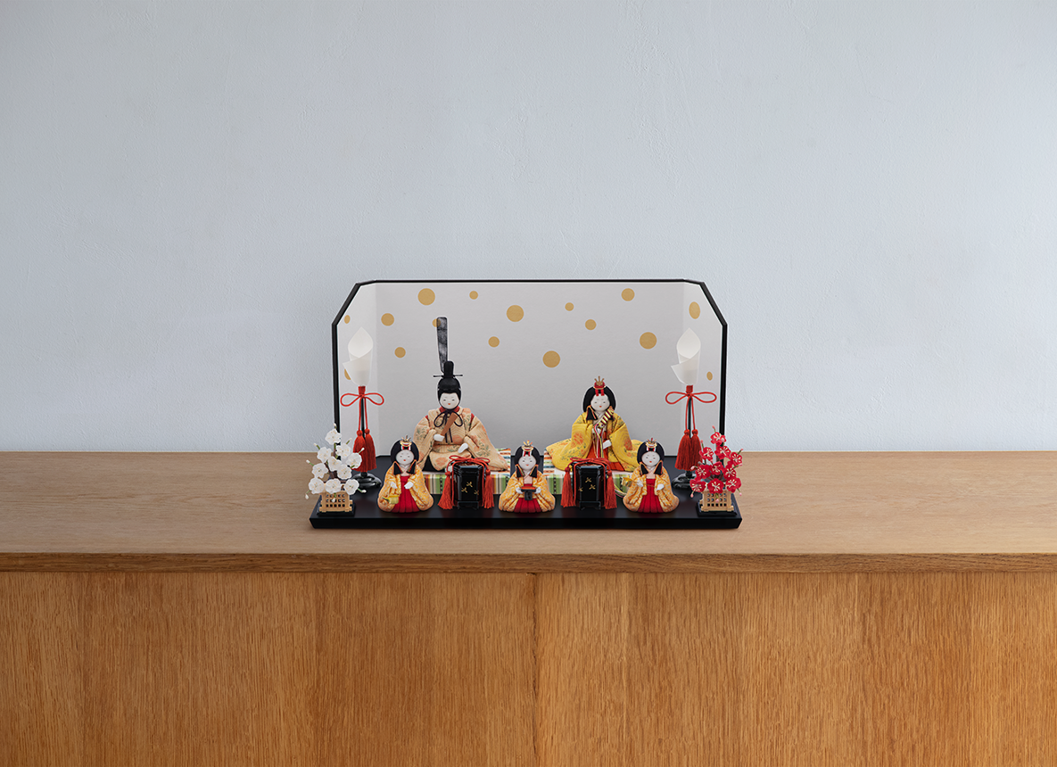飾り台やお屏風が選べる、コンパクトで飾りやすいHINAシリーズの雛人形です。赤ちゃんのように幼いというよりは、成長された上品なお姿で、ほほえみかけてくれているような表情にほっこりと癒やされる、愛くるしい雛人形です。こだわりぬいたお人形さんの見どころはお衣装です。高級織物・龍村裂を着せており、ツヤを含んだ上質な生地に、高位の方々が愛した、風流なナデシコのお花が可憐に浮かび上がります。体の造形は、お殿様お姫様ともに袂(たもと)の流麗さ、足を組んだ形に至るまでフォルムの端正さが、お顔とお衣装の魅力を引き立てます。空気をまとったように贅沢に結われた髪型は、多くの絹糸を丁寧にまとめあげて仕上げております。お顔、造形、お衣装、髪など木目込み人形の命とも言える要素が渾然一体となって表された至極の作品です。殿姫同様に、お子様の行く末頼もしい成長を見守る三人官女は、雛人形の華やかでいながら厳かな味わいを豊かにします。かわいいだけでは終わらない、伝えるべき大切な日本文化の美しさをこの場へ現出させてくれます。雛人形として欠かすことのできない三人官女も私たちのこだわりです。コンパクトの平らな飾り台に、すっきりとしたお屏風で飾るセットです。永くお飾りするお雛様。訪れる桃の節句が毎年楽しみになるような雛人形です。