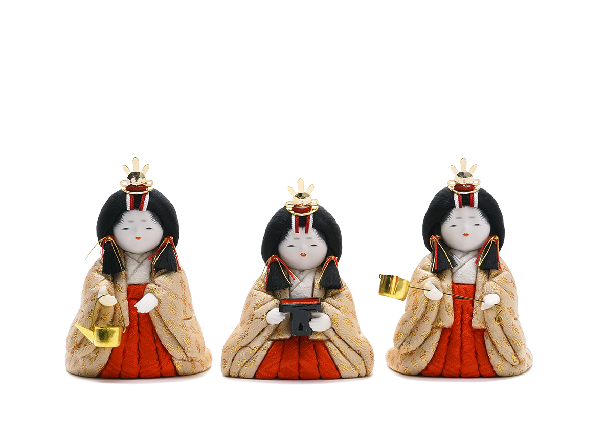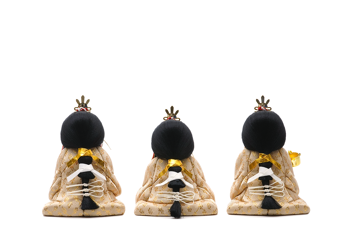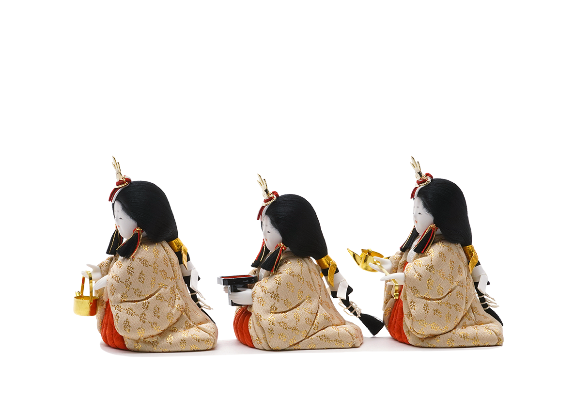 お殿さまとお姫さまのふたり飾り(親王飾り)に加えて頂く三人官女のお人形です。愛らしい表情の中に、親王様へお仕えし、見護るにふさわしい慈愛が満ちています。三人の方々は独特のお道具を携えます。向かって右は「長柄銚子」(ながえのちょうし)、中央は「三方」(さんぽう)を、左には「加銚子」(くわえのちょうし)を手にします。いずれも宮中での行事や神事に由来し、雛人形の華やかでいながら厳かな雰囲気を増します。かわいいだけでは終わらない、伝えるべき大切な日本文化の美しさをこの場へ現出させてくれます。雛人形として欠かすことのできない三人官女も、こだわりを持ってお作りしております。皆々美しく空気をまとった絹糸の髪型、お衣装は高級織物の龍村裂の布地を着せつけました。かわいい中にも優雅さのある、打ち掛けを羽織ったお姿です。