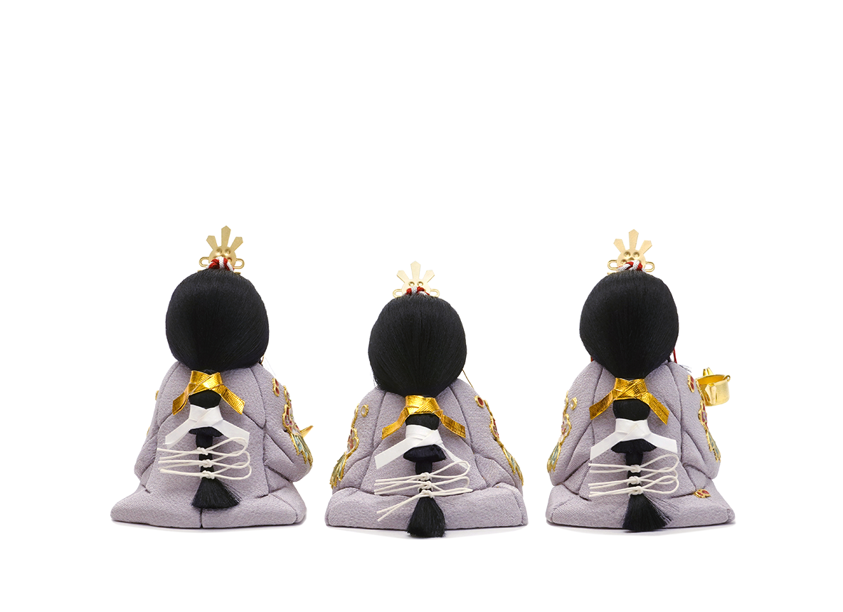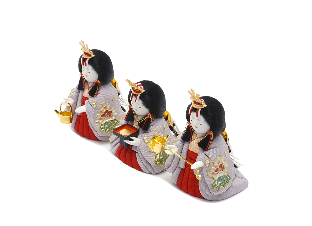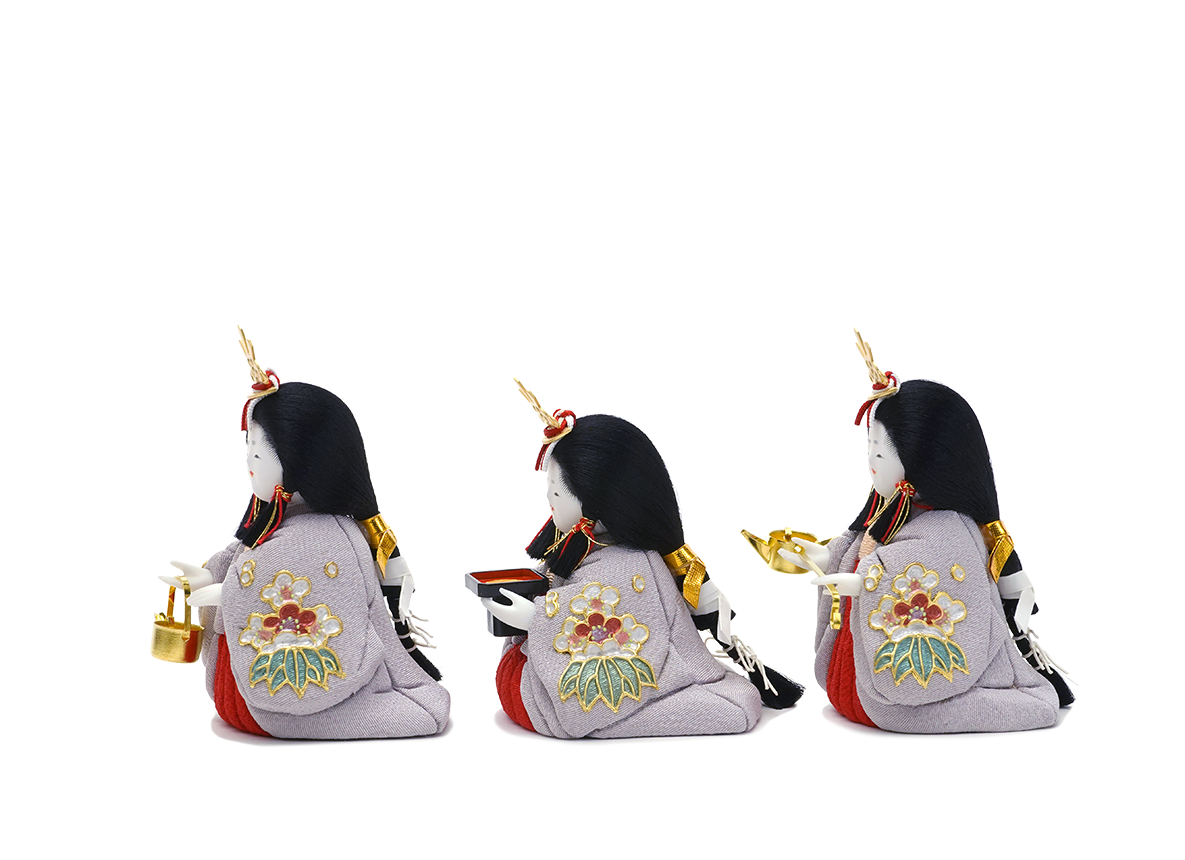 お殿さまとお姫さまのふたり飾り(親王飾り)に加えて頂く三人官女のお人形です。愛らしい表情の中に、親王様へお仕えし、見護るにふさわしい慈愛が満ちています。三人の方々は独特のお道具を携えます。向かって右は「長柄銚子」(ながえのちょうし)、中央は「三方」(さんぽう)を、左には「加銚子」(くわえのちょうし)を手にします。いずれも宮中での行事や神事に由来し、雛人形の華やかでいながら厳かな味わいを豊かにします。かわいいだけでは終わらない、伝えるべき大切な日本文化の美しさをこの場へ現出させてくれます。雛人形として欠かすことのできない三人官女も、こだわりを持ってお作りしております。こちらの三人官女は、薄い藤色のお衣装に贅沢にも蒔絵の技法(手描きで直接衣装に本金箔を使って描く)を用い、絵柄を施しました。春に先駆けて咲くことから縁起の良い梅と、繁栄を示す笹を盛り込みました。それのみならず、皆々美しく空気をまとった絹糸の髪型が目を惹きます。かわいらしくも上品に打ち掛けを羽織った姿です。