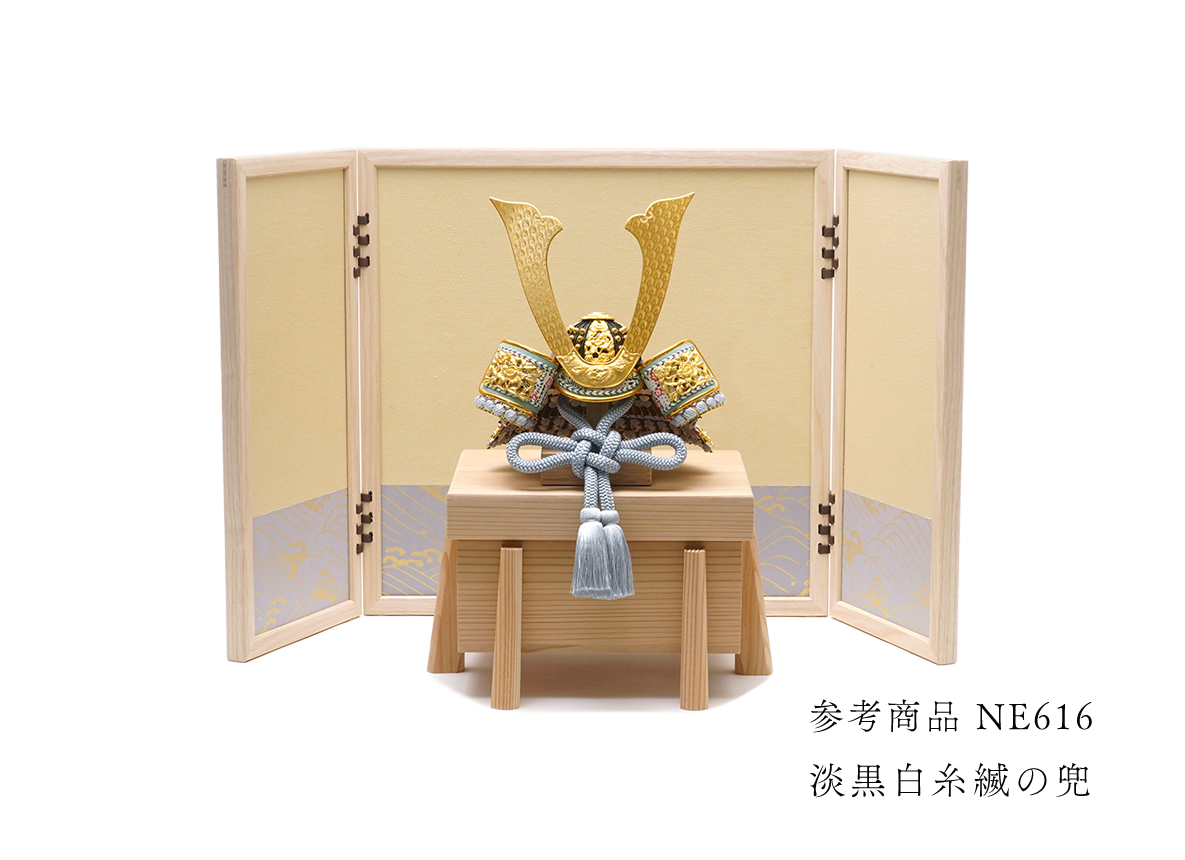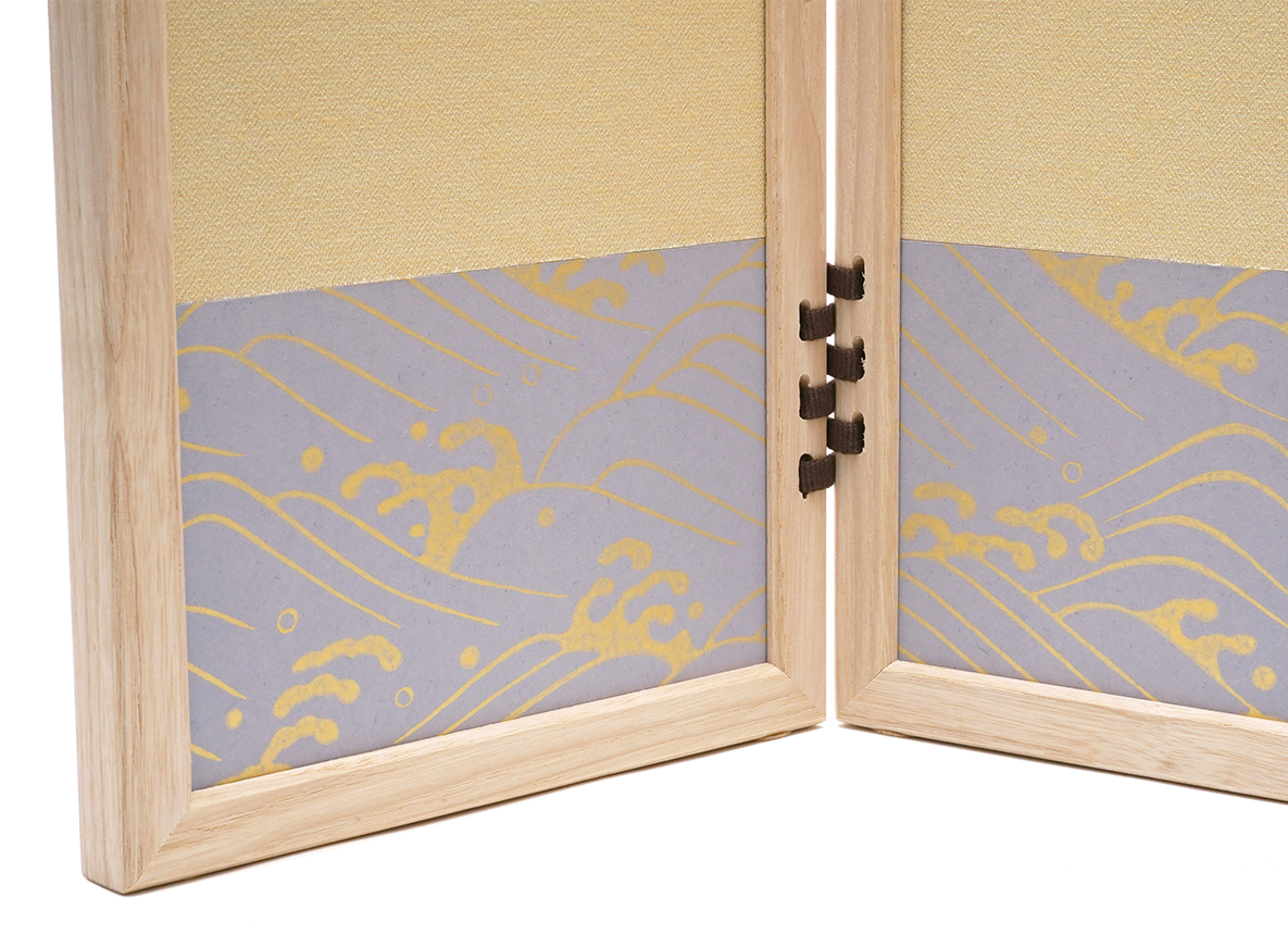 五色オリジナル兜の杉櫃飾りシリーズ用の白木枠の屏風です。力強い波の美しさが兜を引き立てます。兜と調和させるため、その枠は通常の黒ではなく白木仕様となっております。五色のこだわり兜が特別なセットになるでしょう。