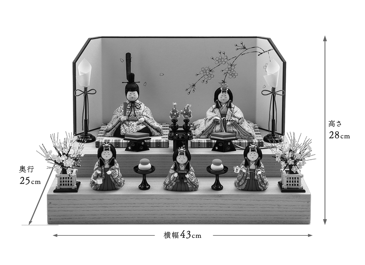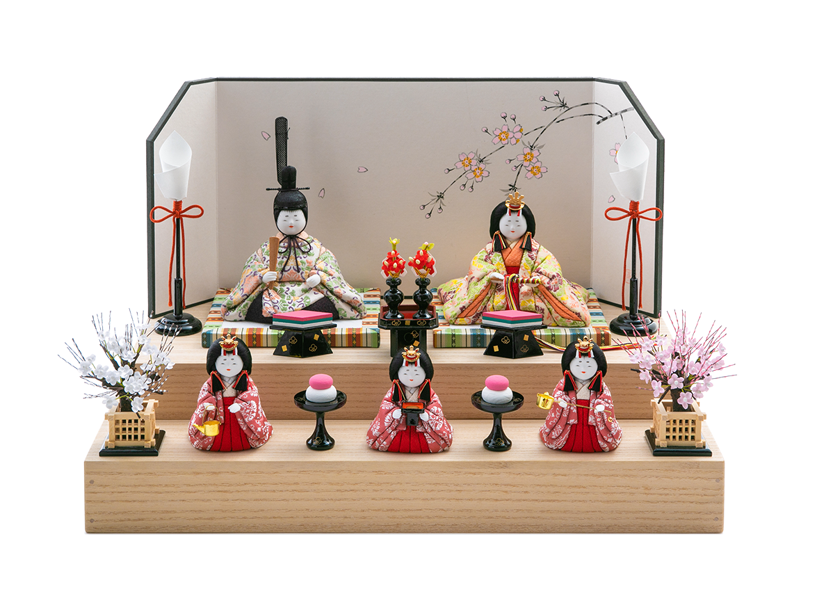 まず目を惹くのは、お殿様お姫様が仲睦まじく着ているツヤのある西陣織のお衣装です。多くの色糸を織り込んで前後ろあますところなく彩り豊かな花菱模様が浮かび上がり、とても華やぐ雛人形となりました。上品で格調高いお衣装に合わせ、お顔は五色・原孝洲独特のかわいらしい丸顔の優しさいっぱいの表情となりました。三人官女も全体の風合いに合うよう製作しました。手にお道具を携え、打ち掛けを羽織った姿がとてもかわいいと好評です。殿姫同様に、お子様の行く末頼もしい成長をお守りする三人官女は、雛人形の華やかでいながら厳かな味わいを豊かにします。かわいいだけでは終わらない、伝えるべき大切な日本文化の美しさをこの場へ現出させてくれます。雛人形として欠かすことのできない三人官女も私たちのこだわりです。特にお子様に人気なのは、木製でできた菱餅や紅白餅など小さなお道具たち。成長されたお子様が、ご自身でお人形やお道具をお飾りする姿が目に浮かぶようです。インテリアともよく調和するデザインの飾り台は、重ねて飾り段にする簡単な仕組みです。段飾りになっていることで、殿姫・三人官女が立体的に美しく見えます。選べる屏風でお飾りするセットです。待ちに待ったひな祭りを末永くお楽しみいただける雛人形です。