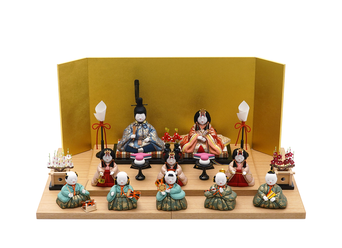 桃の節句の気分を盛り上げる五人囃子まで揃った十人のセットで、複雑な組み立てなどがなく、気軽にお飾りできる雛人形です。こちらのお人形の最大の見どころは、お殿様・お姫様から五人囃子に至るまで、十人ともに最高級織物・龍村裂(たつむらぎれ)のお衣装を身にまとっていることです。ツヤのある美しい布地には、遠き奈良〜平安時代にシルクロードから日本へ伝わった、ペルシャ風の草花模様をイメージさせる雅な柄を織り込み着せ付けました。上品で素敵なお衣装に合わせ、お顔立ちもただ幼いだけではない、柔らかみと気品の融合を大事にした五色・原孝洲が大切にする姿となりました。三人官女は、香り立つ品格の中に親王様へお仕えし、見護るにふさわしい慈愛で満ちています。三人の方々は独特のお道具を携えます。向かって右は「長柄銚子」(ながえのちょうし)、中央は「三方」(さんぽう)を、左には「加銚子」(くわえのちょうし)を手にします。いずれも宮中でのおつとめや行事に由来し、雛人形の華やかでいながら厳かな雰囲気を増します。五人囃子は、他ではなかなか見ることのできない昔の子供の髪型を再現しているのがとても人気です。向かって右より、謡(うたい)、笛、小鼓(こつづみ)、大鼓(おおつづみ)、太鼓(たいこ)の順で、宴にふさわしい華やぎで、お子さまを笑顔にするようなそんな作品です。薄く平たい台を重ねて段にし、選べる屏風を立ててお飾りいただくセットです。お子様の成長を末長く見守るにふさわしい堂々としたお雛さまです。