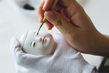 面相筆と呼ばれる極細の筆を使って、面相師が眉、目、口、髪の生え際を描きます。なかでも目元を描く「笹目(ささめ)技法」と、髪の生え際を長短の線で描く「描き下げ」は、五色のお人形の最大の特徴です。この技法は高い技術が必要とされ、一人前になるまでには十数年かかります。