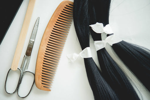 漆黒に染色した上質のスガ糸を、一般の髪付けで使われる量の2倍以上を使います。髪付け用の溝の長さは短くしてしまうと年月を経ると髪がくずれる場合もあります。そのためもみ上げ部分から髪の生え際すべてに溝を彫り、頭頂部と後頭部にもスガ糸を埋め込みます。たっぷりのスガ糸で結い上げることで美しく仕上がります。