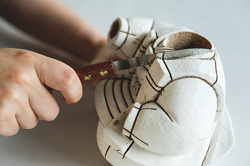 乾燥させたボディや胡粉塗りのボディに衣装を木目込む溝を彫ります。筋の入れ方次第で仕上がりに違いがでるため、三世・原裕子が筋彫りの線を最終的に調整します。衣装の織りや柄の向き、座りや立ち姿などを考慮して裂地にしわや浮きが出ないように線を書き入れます。筋彫師は溝の太さや深さに合わせて均一に彫り込んでいきます。