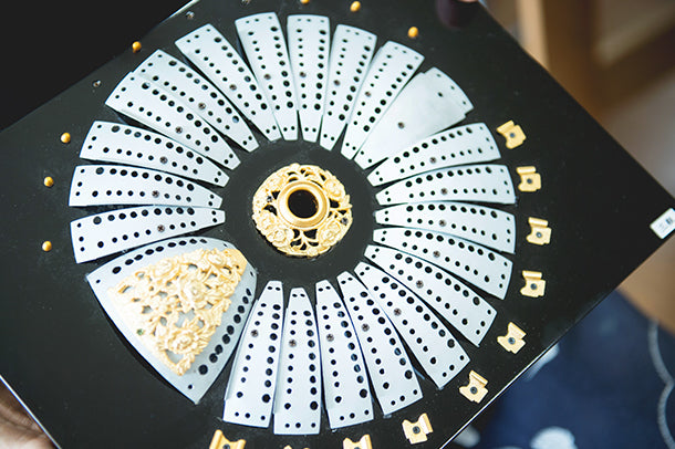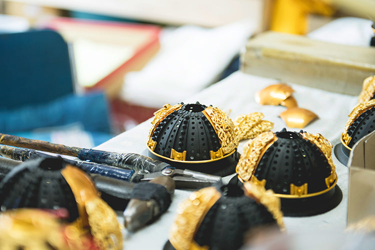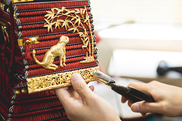 日本古来の伝統技法によって装飾は制作されています。複雑な形や表面の凹凸に薄い金箔を均一に押す箔押師、鉄や皮の素材を黒塗りや白檀塗りに仕上げる塗師、細かい成形が重要となる鋳物師や彫刻師。たくさんの職人技を結集した美術工芸品としても価値の高い鎧飾りや兜飾りは、見る人の心を惹きつけます。