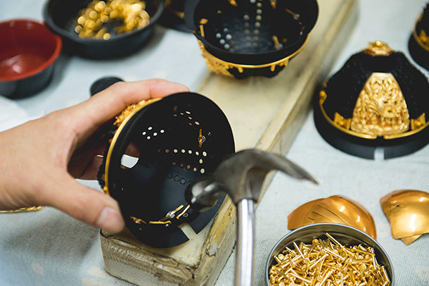 兜の鉢と呼ばれる丸みは、鍛金師が金属板から成形した一枚一枚を寸分違わずはぎ合わせて半円球形にかしめます。表面を塗師が漆を施し、箔押師が金箔の装飾を施し、最後に兜の前面に真鍮から切り抜いた鍬形を取り付けて完成。鍛金師の仕事の範囲は広く、鎧も含めて金属部全般を一手に担います。