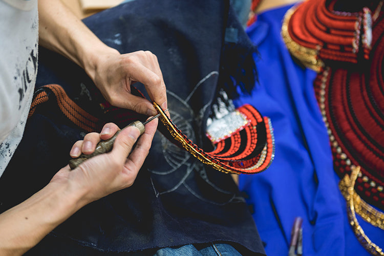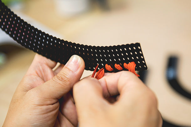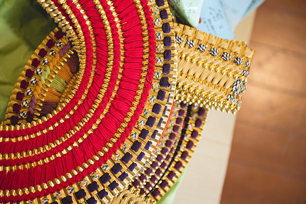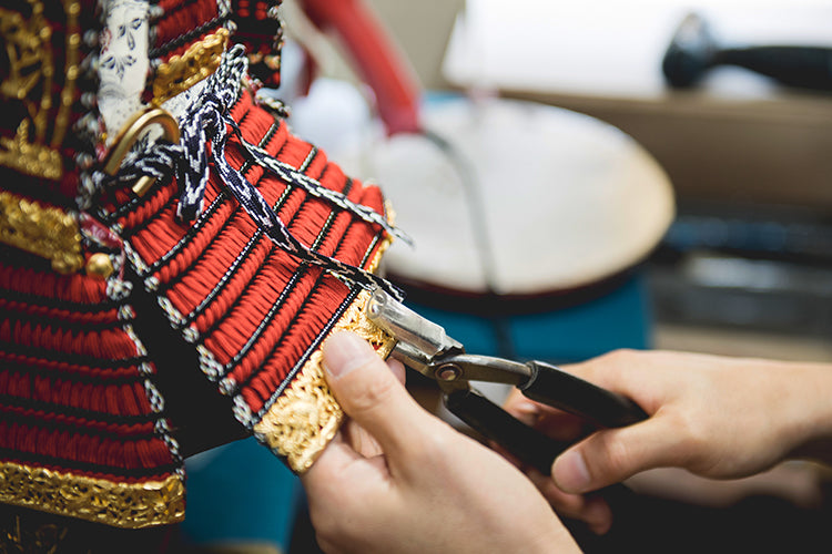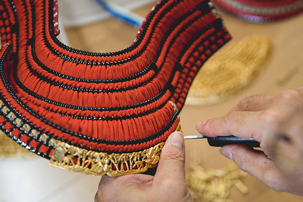 配色の要となる縅糸(おどしいと)は、房師が正絹糸を使って平打ちの組紐などに編み上げます。鎧の胴体部分やその下の草摺、両腕の大袖、兜の鉢まわりの首を防御する“しころ”など、小札板に編み込んで仕上げます。五色の鎧飾りには、三世・原裕子が縅糸の配色を手掛けたコラボレーション商品もあります。