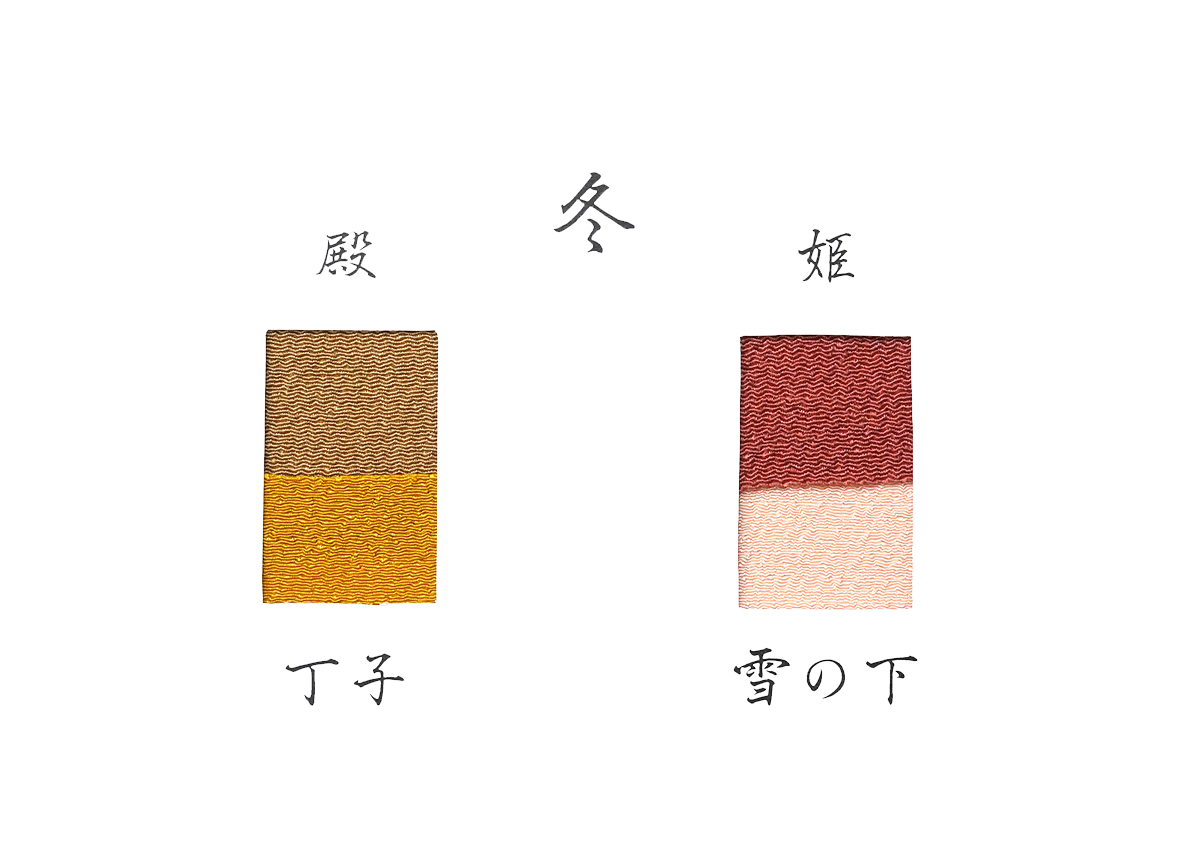 ・殿:香りに身体を温める効果があることで冬に好まれた丁子 (ちょうじ)の色目 ・姫:紅梅に雪が積もった様子を表す色目