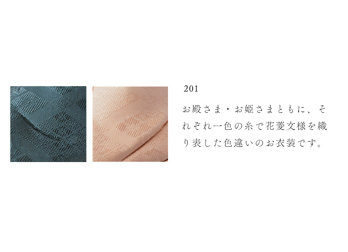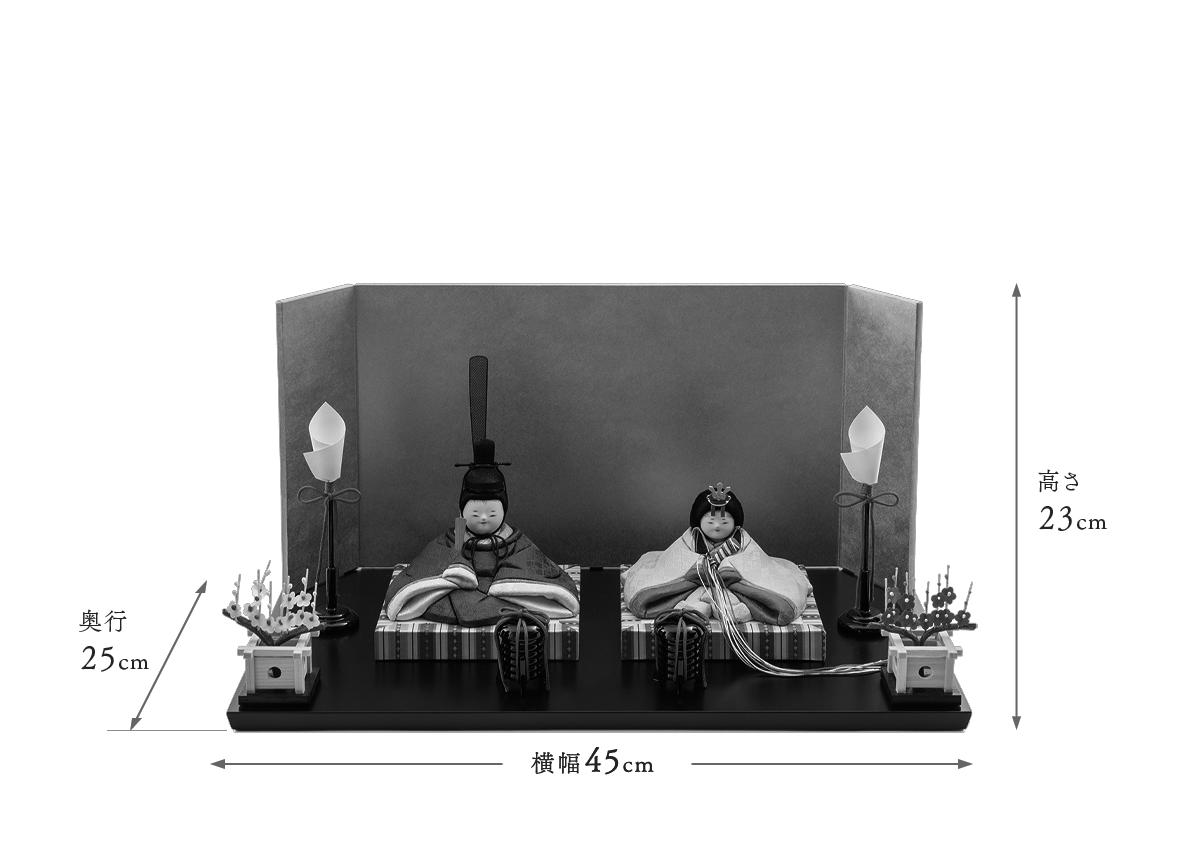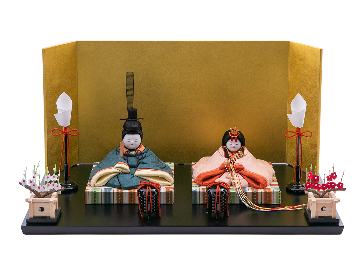 まるで赤ちゃんがおくるみに包まれたかのような、平らかなボディがとても愛くるしいと人気の雛人形です。飾り台やお屏風が選べる、コンパクトで飾りやすいHINAシリーズの雛人形です。福々しい丸いお顔のなかにも凛とした空気をまとった五色・原孝洲のこだわりのお雛さまです。ふんわりと空気をまとったように贅沢に結われた髪型は、多くの絹糸を丁寧にまとめあげて仕上げており、生え際まで筆で丁寧に描きこむことで、上品なお顔だちとのバランスに優れています。お衣装はそれぞれに絹織物本来のツヤのある生地へ、一色の色糸を巧みに用いて、雅さと優しさをあわせ持つ花菱文様の柄を織り表しました。お姫様お殿様のどちらも、ふんわりとした着物を実際にまとっているかのような、袂(たもと)や袴(はかま)のひだの表現など、木目込み人形としての高い技術水準を示しています。収納にも困らないと好評の、組み立て不要の軽くて薄い台と屏風でお飾りする、上品でおしゃれな雛人形です。