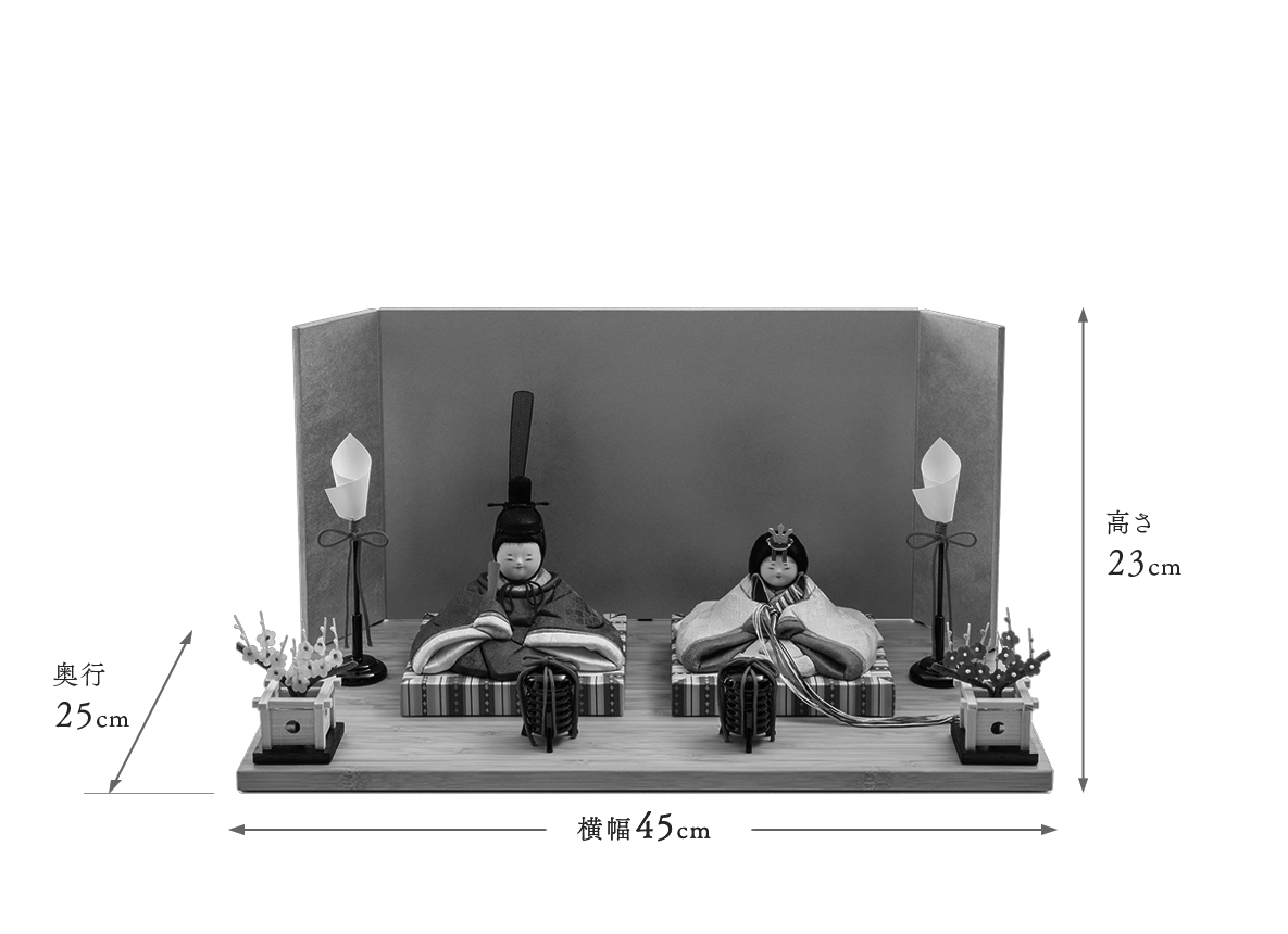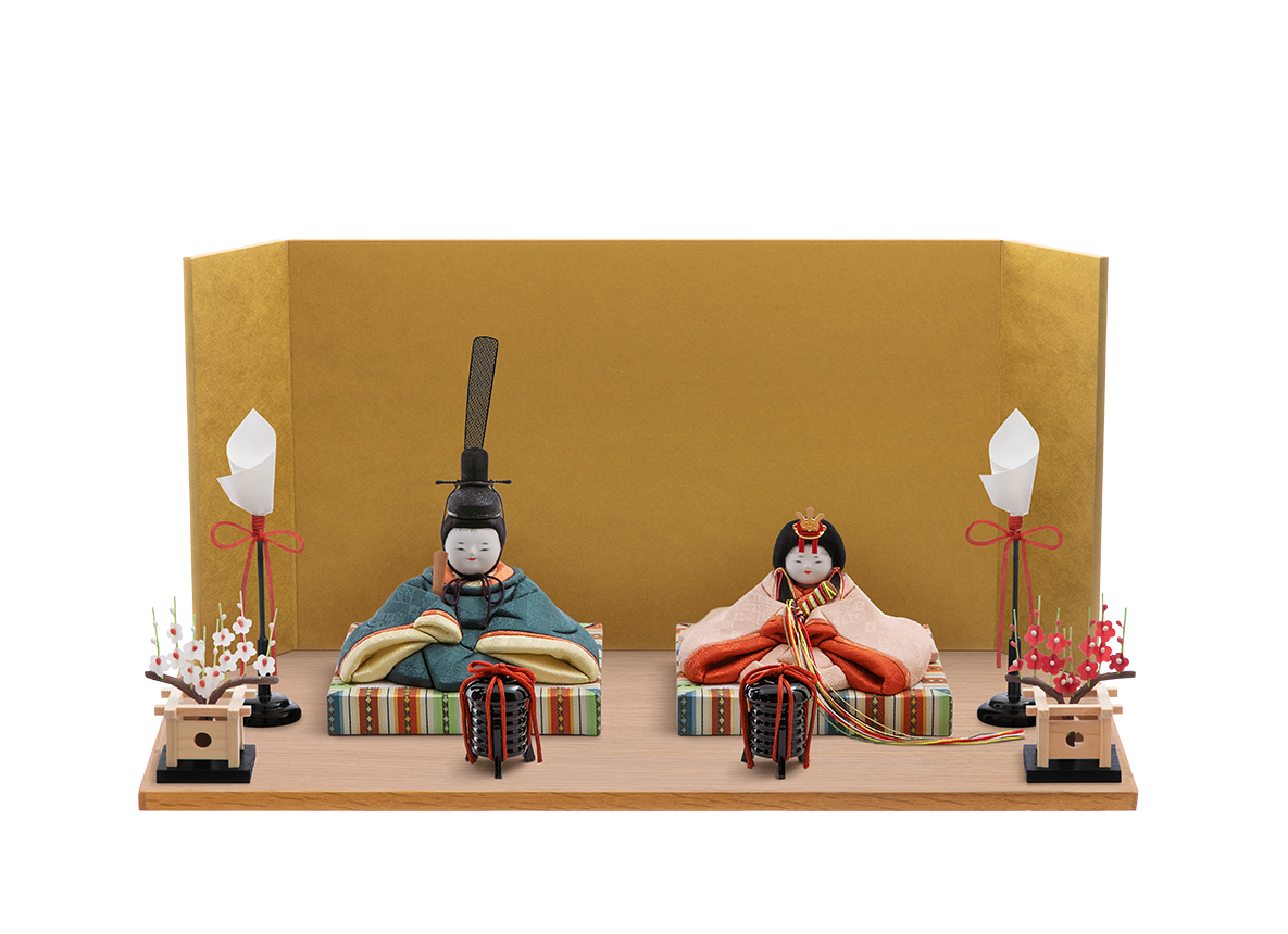 まるで赤ちゃんがおくるみに包まれたかのような、平らかなボディがとても愛くるしいと人気の雛人形です。飾り台やお屏風が選べる、コンパクトで飾りやすいHINAシリーズの雛人形です。福々しい丸いお顔のなかにも凛とした空気をまとった五色・原孝洲のこだわりのお雛さまです。ふんわりと空気をまとったように贅沢に結われた髪型は、多くの絹糸を丁寧にまとめあげて仕上げており、生え際まで筆で丁寧に描きこむことで、上品なお顔だちとのバランスに優れています。お衣装はそれぞれに絹織物本来のツヤのある生地へ、一色の色糸を巧みに用いて、雅さと優しさをあわせ持つ花菱文様の柄を織り表しました。お姫様お殿様のどちらも、ふんわりとした着物を実際にまとっているかのような、袂(たもと)や袴(はかま)のひだの表現など、木目込み人形としての高い技術水準を示しています。収納にも困らないと好評の、組み立て不要の軽くて薄い台と屏風でお飾りする、上品でおしゃれな雛人形です。
