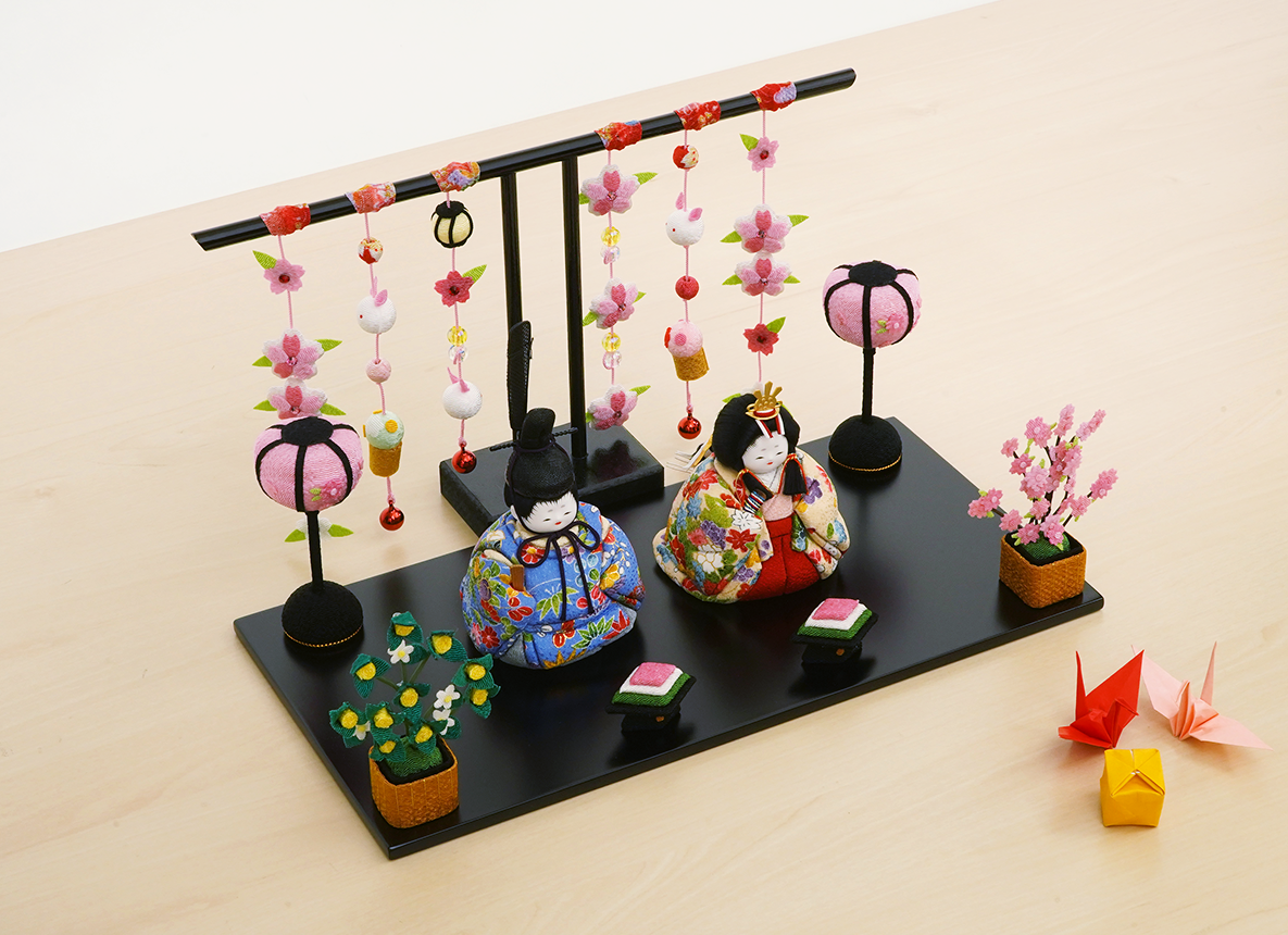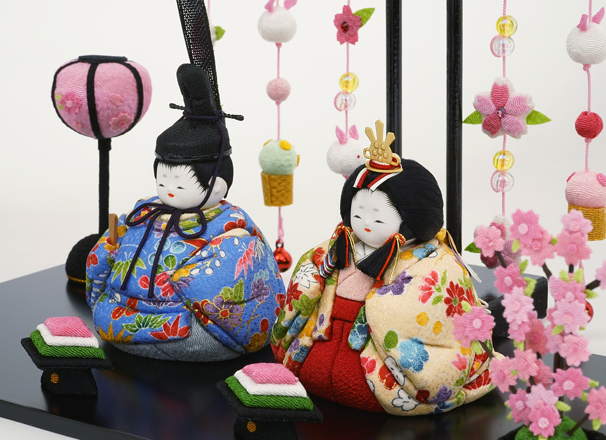 ひな祭りを祝福する、華やかで彩り豊かなセットです。「高品質なひな人形を飾りたいけど、飾る場所がない・・・」のお声にお応えした、コンパクトなお飾りです。ころころとした可愛いフォルムに、ほほえみかけてくれているような表情はほっこりとする作品。お子様にとり、とても愛着をもつ作品となることでしょう。飾る場所を選ばないのに、存在感たっぷりの人気作です。