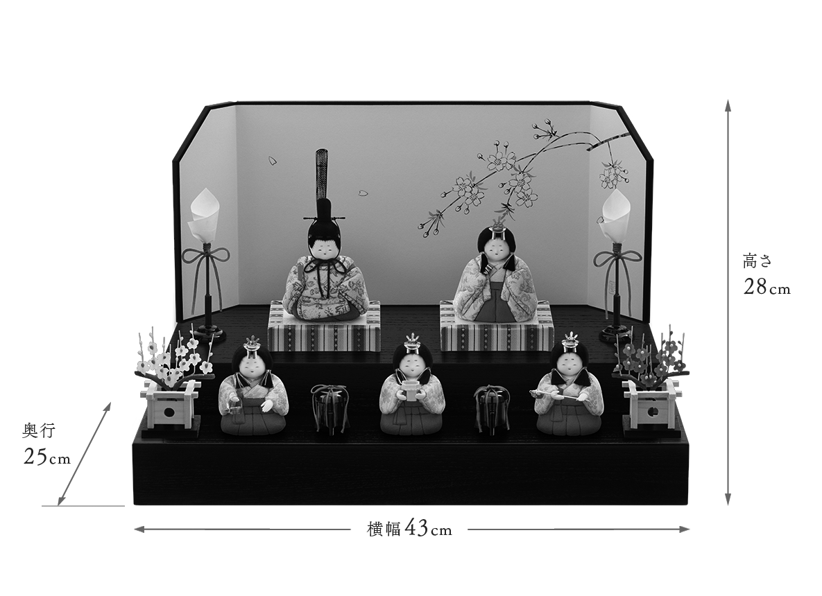 お衣装はたて糸とよこ糸を組み合わせて細かな柄を織り表す金襴地です。白地に牡丹唐草という、お花の頂点にして格調高い織柄で、昔より多くの方に好まれてきた文様を着せ付けました。上品で落ち着いた伝統的なお衣装と愛くるしいお姿とのバランスが絶妙なお雛様です。殿姫同様に、お子様の行く末頼もしい成長をお守りする三人官女は、雛人形の華やかでいながら厳かな味わいを豊かにします。かわいいだけでは終わらない、伝えるべき大切な日本文化の美しさをこの場へ現出させてくれます。雛人形として欠かすことのできない三人官女も私たちのこだわりです。段飾り上段に殿姫を、下段へ三人官女を並べます。段のお飾りにすることで立体的な美が強調されながらも、台の幅や奥行きがほぼ変わらない点も大変人気です。