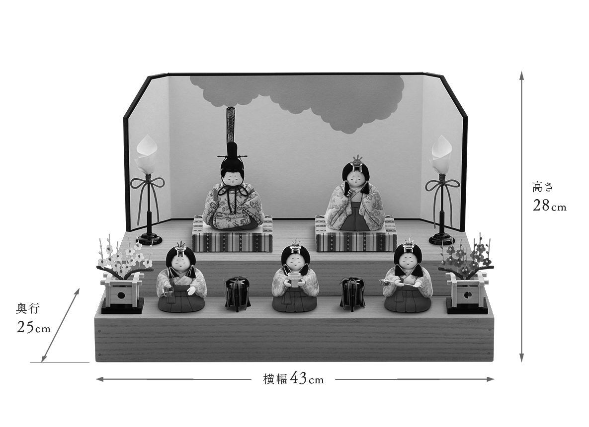 お衣装はたて糸とよこ糸を組み合わせて細かな柄を織り表す金襴地です。白地に牡丹唐草という、お花の頂点にして格調高い織柄で、昔より多くの方に好まれてきた文様を着せ付けました。上品で落ち着いた伝統的なお衣装と愛くるしいお姿とのバランスが絶妙なお雛様です。殿姫同様に、お子様の行く末頼もしい成長をお守りする三人官女は、雛人形の華やかでいながら厳かな味わいを豊かにします。かわいいだけでは終わらない、伝えるべき大切な日本文化の美しさをこの場へ現出させてくれます。雛人形として欠かすことのできない三人官女も私たちのこだわりです。段飾り上段に殿姫を、下段へ三人官女を並べます。段のお飾りにすることで立体的な美が強調されながらも、台の幅や奥行きがほぼ変わらない点も大変人気です。