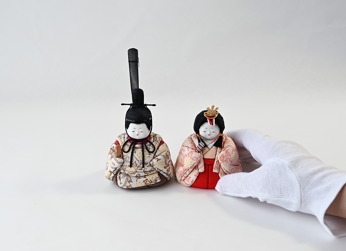 飾り台やお屏風が選べる、コンパクトで飾りやすいHINAシリーズの雛人形です。おだやかな表情、生まれたばかりの赤ちゃんをイメージさせる小さくて丸々としたフォルムは、木目込み人形ならではの雛人形です。小ぶりでも確かなお作りは各部分に表れています。ふんわりと空気を包みこみ、なめならかな髪型が特徴です。お衣装はたて糸とよこ糸を組み合わせて細かな柄を織り表す金襴地です。白地に牡丹唐草という、お花の頂点にして格調高い織柄で、昔より多くの方に好まれてきた文様を着せ付けました。上品で落ち着いた伝統的なお衣装と愛くるしいお姿とのバランスが絶妙なお雛様です。殿姫同様に、お子様の行く末頼もしい成長をお守りする三人官女は、雛人形の華やかでいながら厳かな味わいを豊かにします。かわいいだけでは終わらない、伝えるべき大切な日本文化の美しさをこの場へ現出させてくれます。雛人形として欠かすことのできない三人官女も私たちのこだわりです。インテリアに調和する優しい風合いの桐箱には、お人形や小道具から屏風まで、すべて収納して頂けます。
