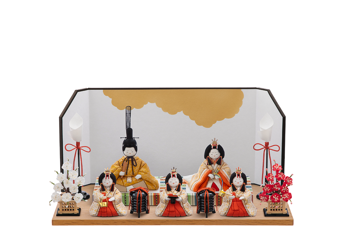 お屏風が選べるコンパクトサイズの雛人形です。お殿様・お姫様をお飾りしている台へ、一緒に三人官女まで並べられる五人飾りです。丸い顔よりは細い顔に属するタイプのこちらの雛人形は、非常に気高さと上品さをたたえた雰囲気となっています。そのため、お衣装には格調高い柄をお選びしました。お殿さまには最高位のお衣装である黄櫨染(こうろぜん)に桐竹鳳凰麒麟の文様の織柄のお衣装を、お姫さまには二重の蔓に大輪の花を咲かせる牡丹文様を織り表した柄を着付けました。西陣織のツヤを含んだ生地に高貴な織柄が映えます。お殿様の袂(たもと)のひだの表現、足を組んだ形、お姫さまの袖口の巧みなグラデーションなど、実際に着物を着重ねたようなお姿は、木目込み人形の水準の高さを示します。殿姫同様に、お子様の行く末頼もしい成長をお守りする三人官女は、雛人形の華やかでいながら厳かな味わいを豊かにします。かわいいだけでは終わらない、伝えるべき大切な日本文化の美しさをこの場へ現出させてくれます。雛人形として欠かすことのできない三人官女も私たちのこだわりです。細部にまで手をかけた造型をどうぞご堪能ください。収納の際に便利なセパレートタイプの木目調の飾り台に屏風をのせてお飾り頂く雛人形セットです。