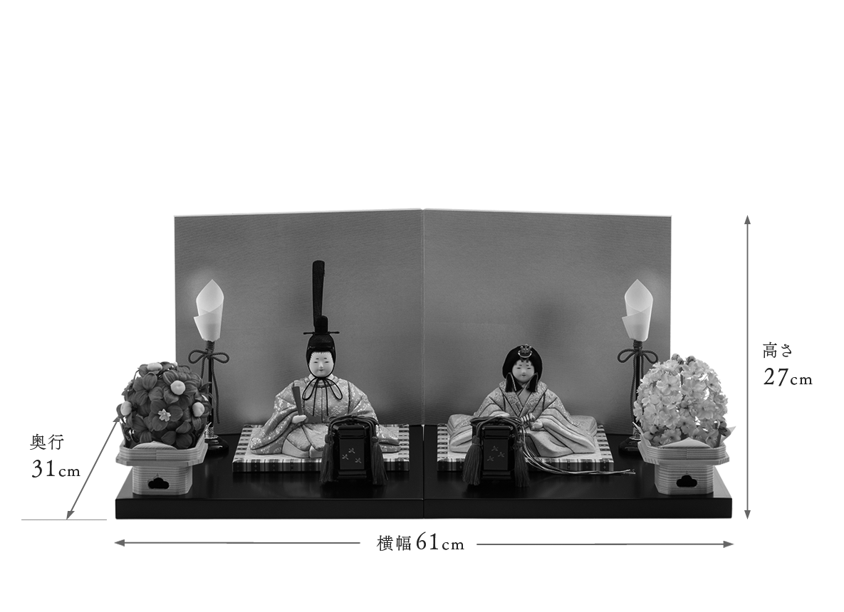 お殿様の袂(たもと)のひだの表現、後背部には下襲の裾(したがさねのきょ)と呼ばれる部分まで再現しております。お姫さまもひだの表現や、後背部の裳袴(もばかま)と呼ばれる部分まで美しく作り込まれ、実際に着物を着重ねたようなお姿は、木目込み人形の水準の高さを示します。細部にまで手をかけた造型をどうぞご堪能ください。金色のお屏風はたたんで、黒色の飾り台の中へ収めることができるので、収納の際にはコンパクトとなるおしゃれな雛人形です。末永くお飾りいただく雛人形として、人気をあつめます。