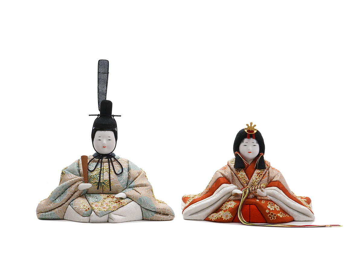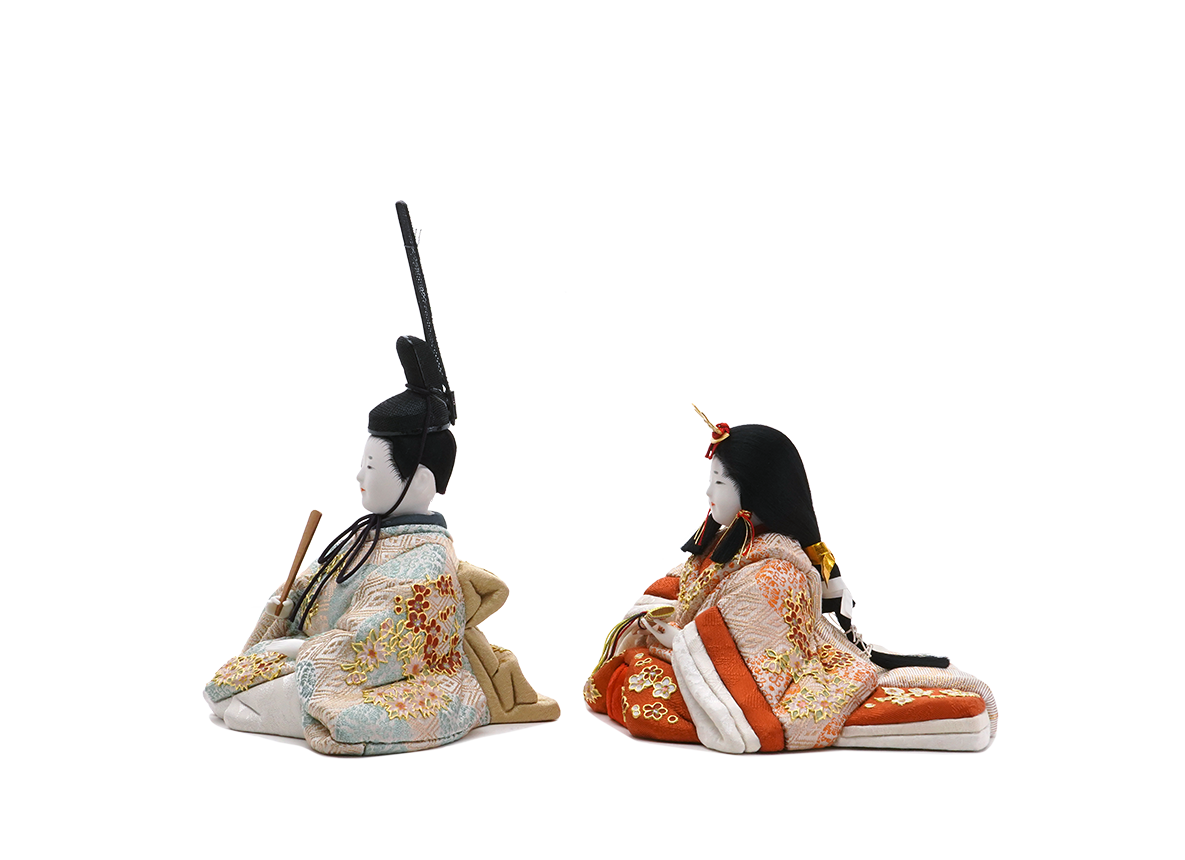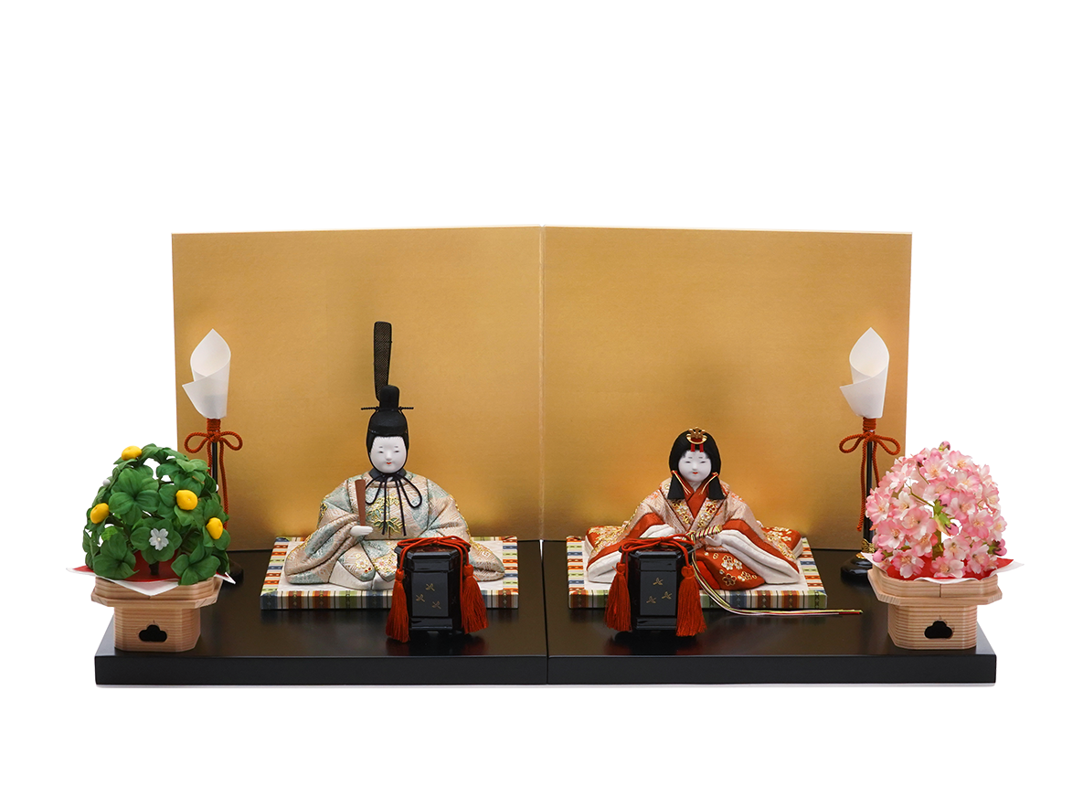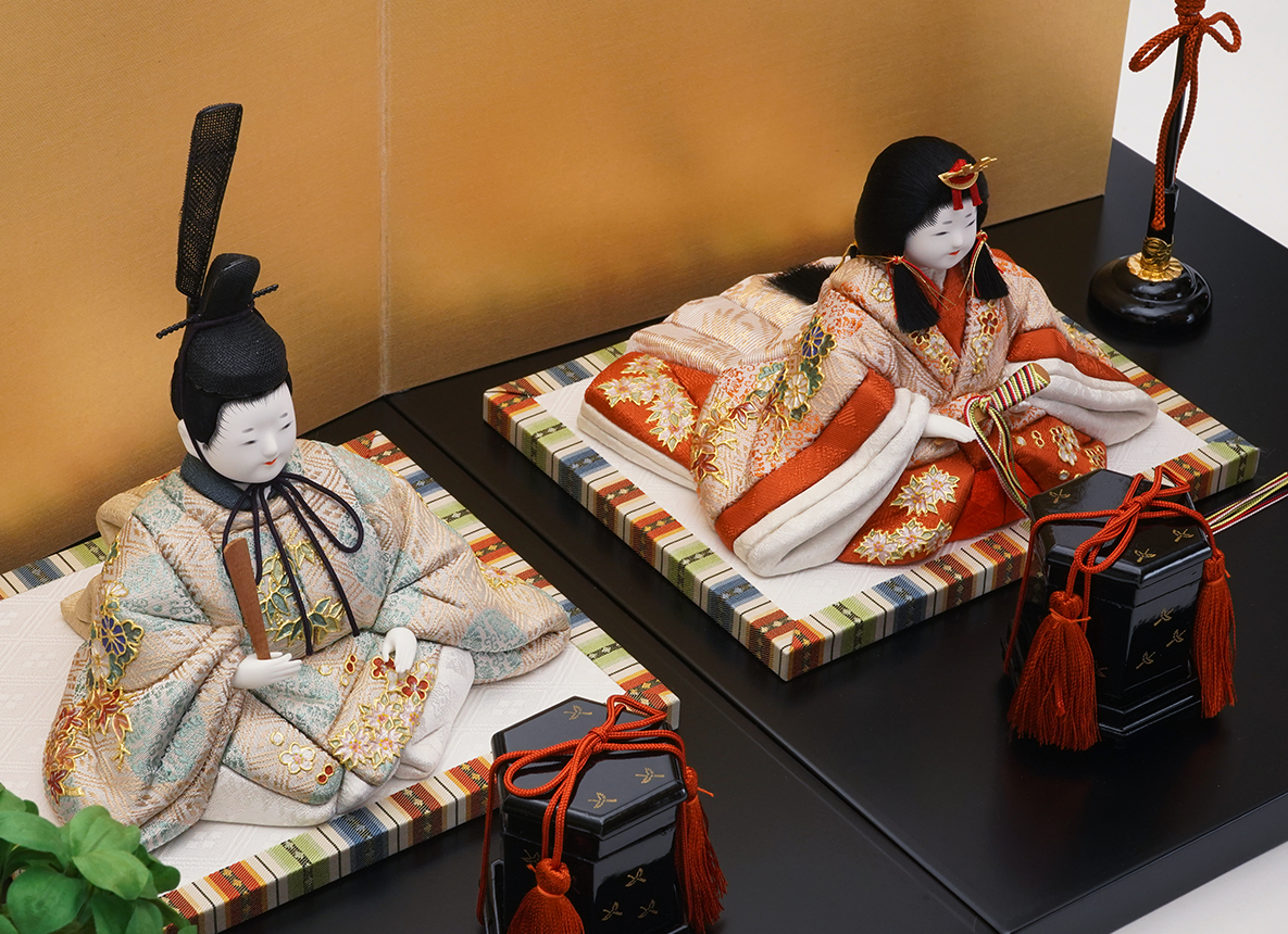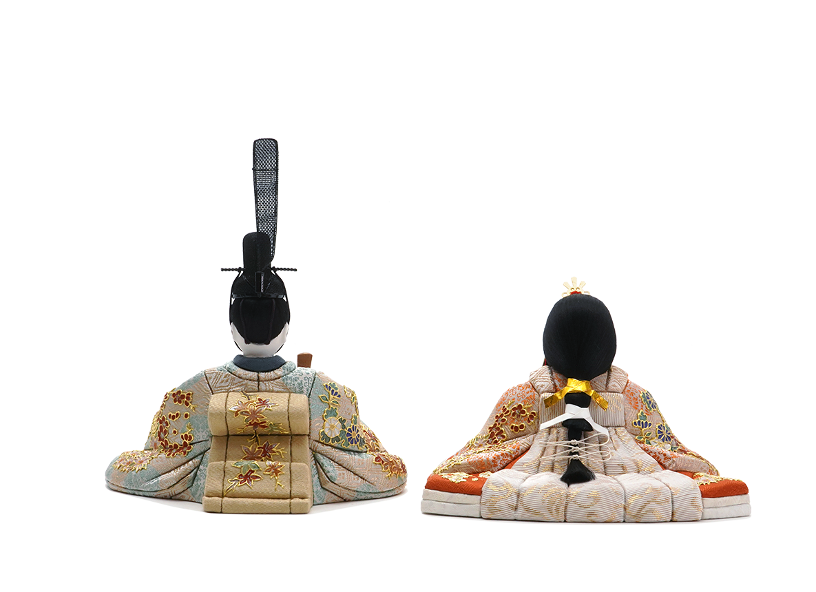 丸い顔よりは細い顔に属するタイプの雛人形です。笹目(ささめ)と呼ばれる技法を用い、細かな筆先で描き出したその顔は奥深い味わいを秘め、見る人の心を魅了してやみません。 大人のお顔立ちに合わせ、お衣装には、寿命が長く生命力の強い藤の丸紋が織り込まれた絹織物の上に本金で四季の草花を描いた大変高価なお衣装。原 孝洲でなければ制作ができない細密な蒔絵はとても豪華で、一際上品なお雛様です。お殿様の袂(たもと)のひだの表現、後背部には下襲の裾(したがさねのきょ)と呼ばれる部分まで再現しております。お姫さまもひだの表現や、後背部の裳袴(もばかま)と呼ばれる部分まで美しく作り込まれ、実際に着物を着重ねたようなお姿は、木目込み人形の水準の高さを示します。細部にまで手をかけた造型をどうぞご堪能ください。金色のお屏風はたたんで、黒色の飾り台の中へ収めることができるので、収納の際にはコンパクトとなるおしゃれな雛人形です。末永くお飾りいただく雛人形として、人気をあつめます。