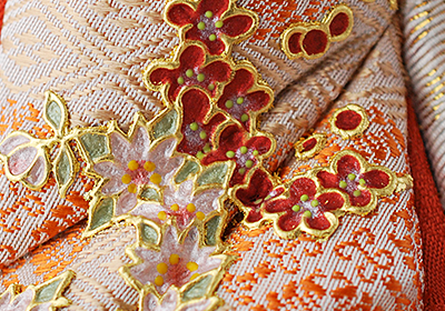 上品なちりめんなどのお衣裳を木目込み後、多彩な色と本金箔で描く蒔絵。盛り上げた絵柄の縁に金箔を貼るほか、多彩な色を重ねて絵柄を描くため、厚みがある豪華な印象で、繊細な模様が可能です。