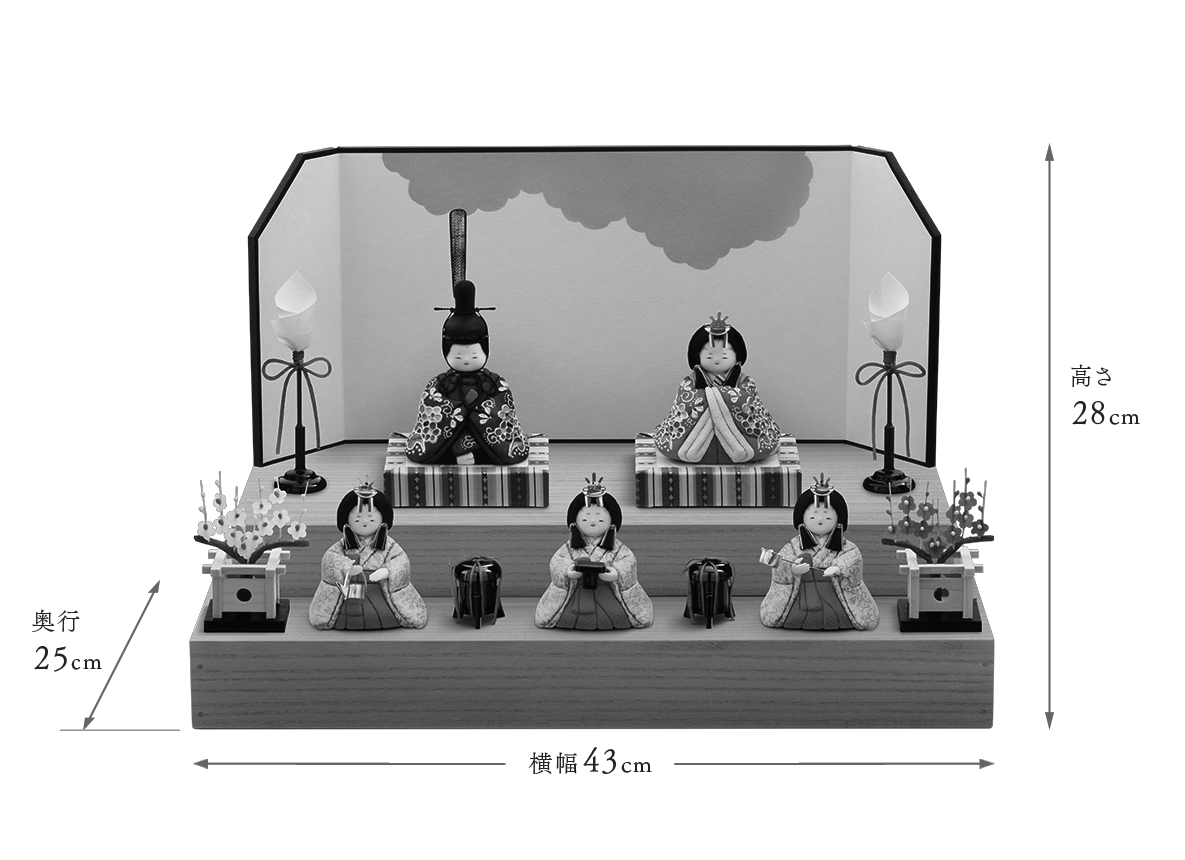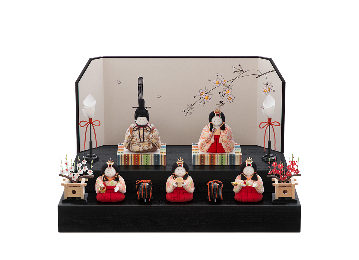 殿姫同様に、お子様の行く末頼もしい成長を見守る三人官女は、雛人形の華やかでいながら厳かな味わいを豊かにします。かわいいだけでは終わらない、伝えるべき大切な日本文化の美しさをこの場へ現出させてくれます。欠かせない三人官女も私たちのこだわりです。飾り方は段飾り上段に殿姫を、下段へ三人官女を並べます。段のお飾りにすることで立体的な美が強調されながらも、台の幅や奥行きがほぼ変わらない点も大変人気です。