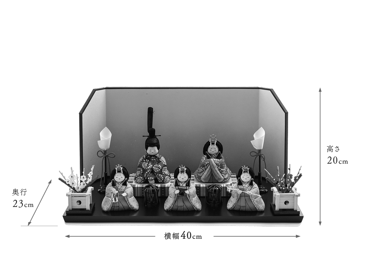 飾り台やお屏風が選べる、コンパクトシリーズの雛人形です。純真無垢な赤ちゃんをイメージさせる小さくて丸々としたフォルムに、両袖を合わせた愛らしいお姿は木目込み人形ならではのスタイルです。 小ぶりでも本格の作り。例えばふんわりと空気をまとう技術となめらかな絹糸を使用した髪型は、美しくも可憐なお雛様をより一層引き立たせます。かわいらしさのなかに上品さをも秘めた手描きのお顔が人気です。お衣装は2種類のご用意。殿姫同様に、お子様の行く末頼もしい成長を見守る三人官女は、雛人形の華やかでいながら厳かな味わいを豊かにします。かわいいだけでは終わらない、伝えるべき大切な日本文化の美しさをこの場へ現出させてくれます。欠かせない三人官女も私たちのこだわりです。組み立て不要の平らな飾り台に、シンプルなデザインの屏風をのせてお飾りする、上品でおしゃれな雛人形です。
