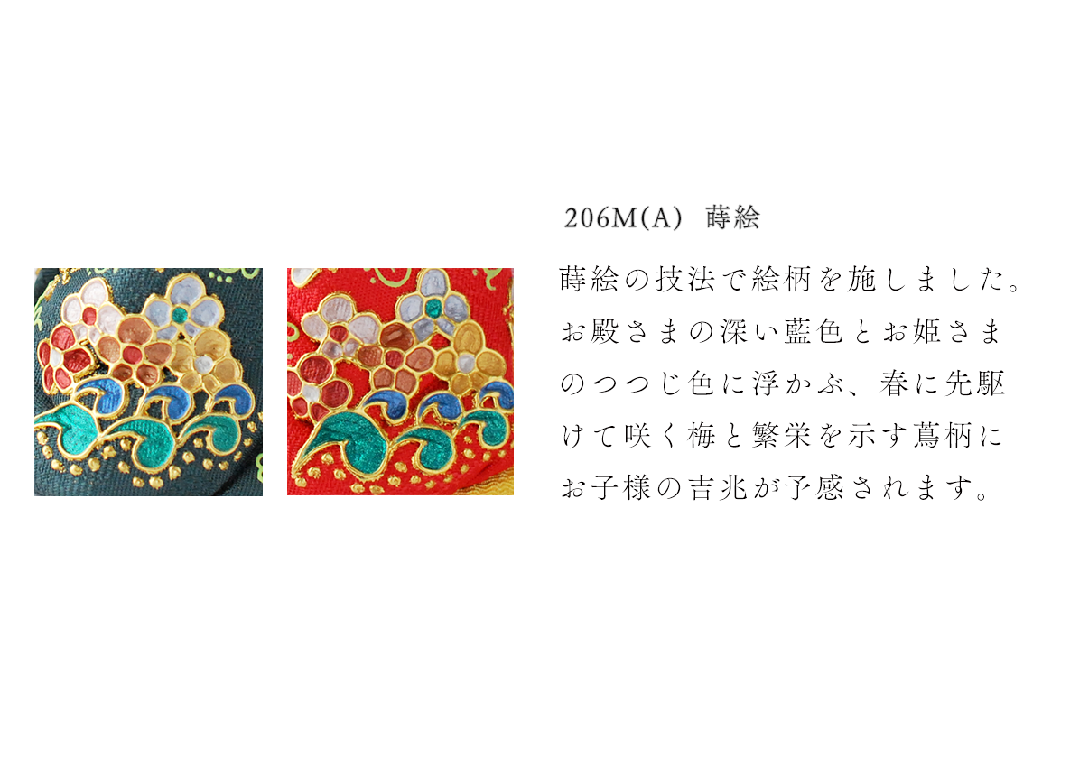 かわいらしさのなかに上品さをも秘めた手描きのお顔が人気です。蒔絵のお衣装は2種類のご用意。優しくほほえむ姿を前にくつろぐ気分は、桃の節句を一段と華やかにすることでしょう。