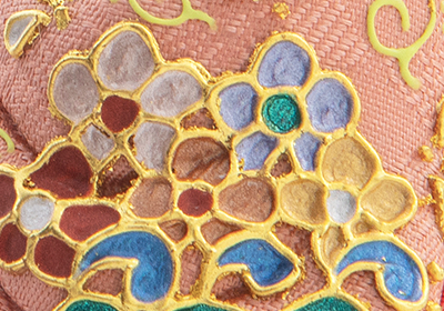 上品なちりめんなどのお衣裳を木目込み後、多彩な色と本金箔で描く蒔絵。盛り上げた絵柄の縁に金箔を貼るほか、多彩な色を重ねて絵柄を描くため、厚みがある豪華な印象で、繊細な模様が可能です。