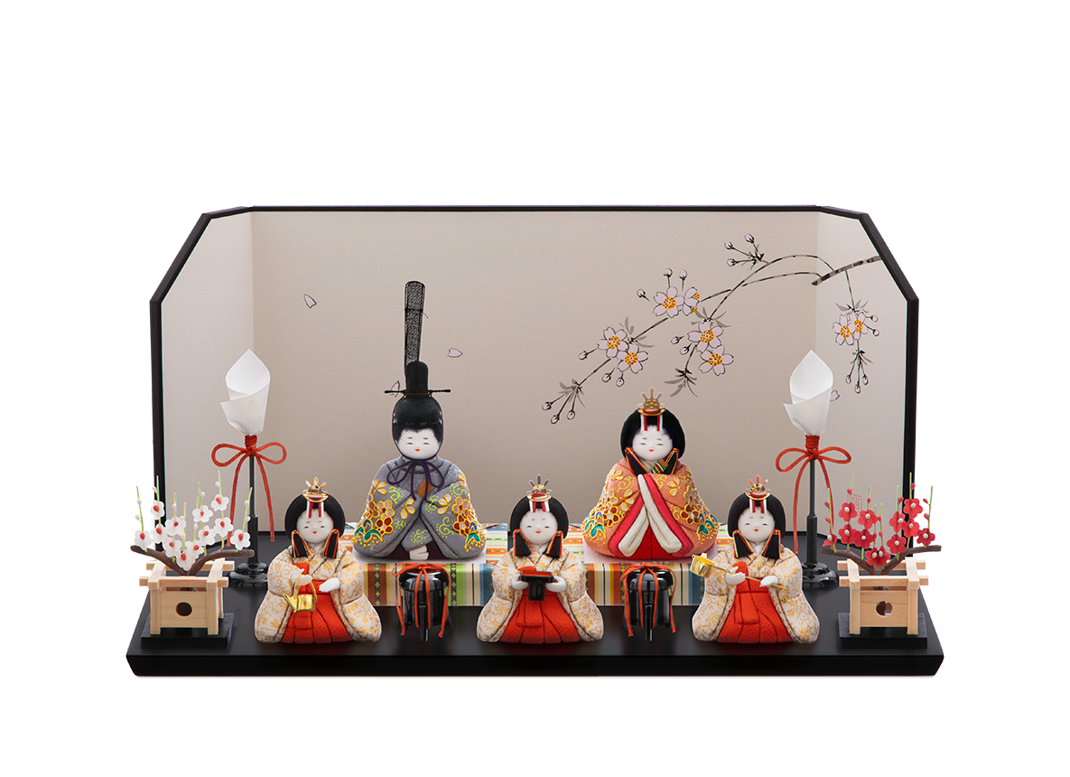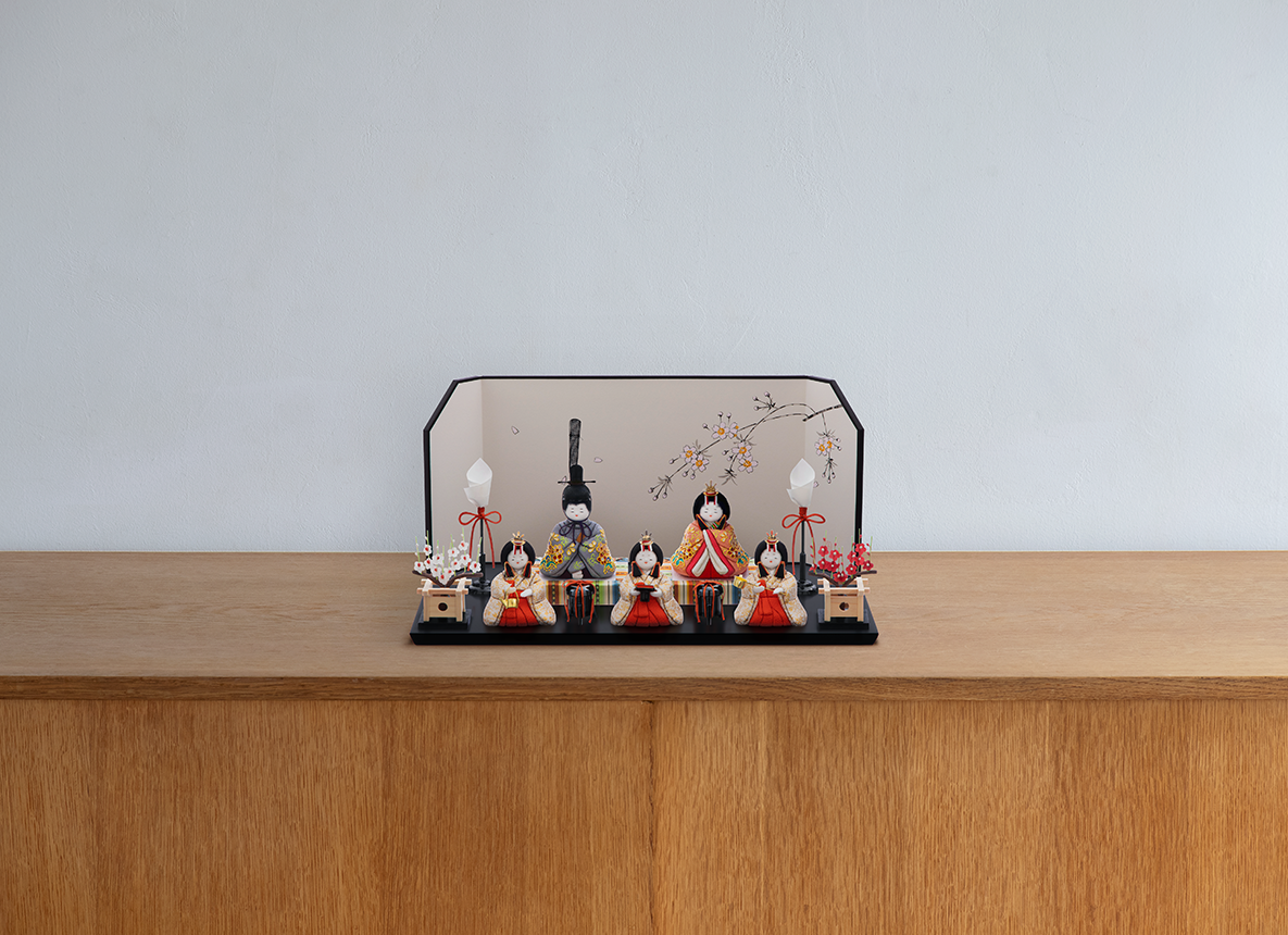 殿姫同様に、お子様の行く末頼もしい成長を見守る三人官女は、雛人形の華やかでいながら厳かな味わいを豊かにします。かわいいだけでは終わらない、伝えるべき大切な日本文化の美しさをこの場へ現出させてくれます。欠かせない三人官女も私たちのこだわりです。組み立て不要の平らな飾り台に、シンプルなデザインの屏風をのせてお飾りする、上品でおしゃれな雛人形です。