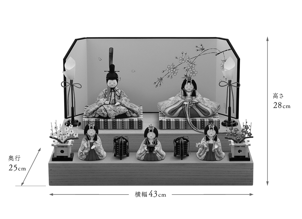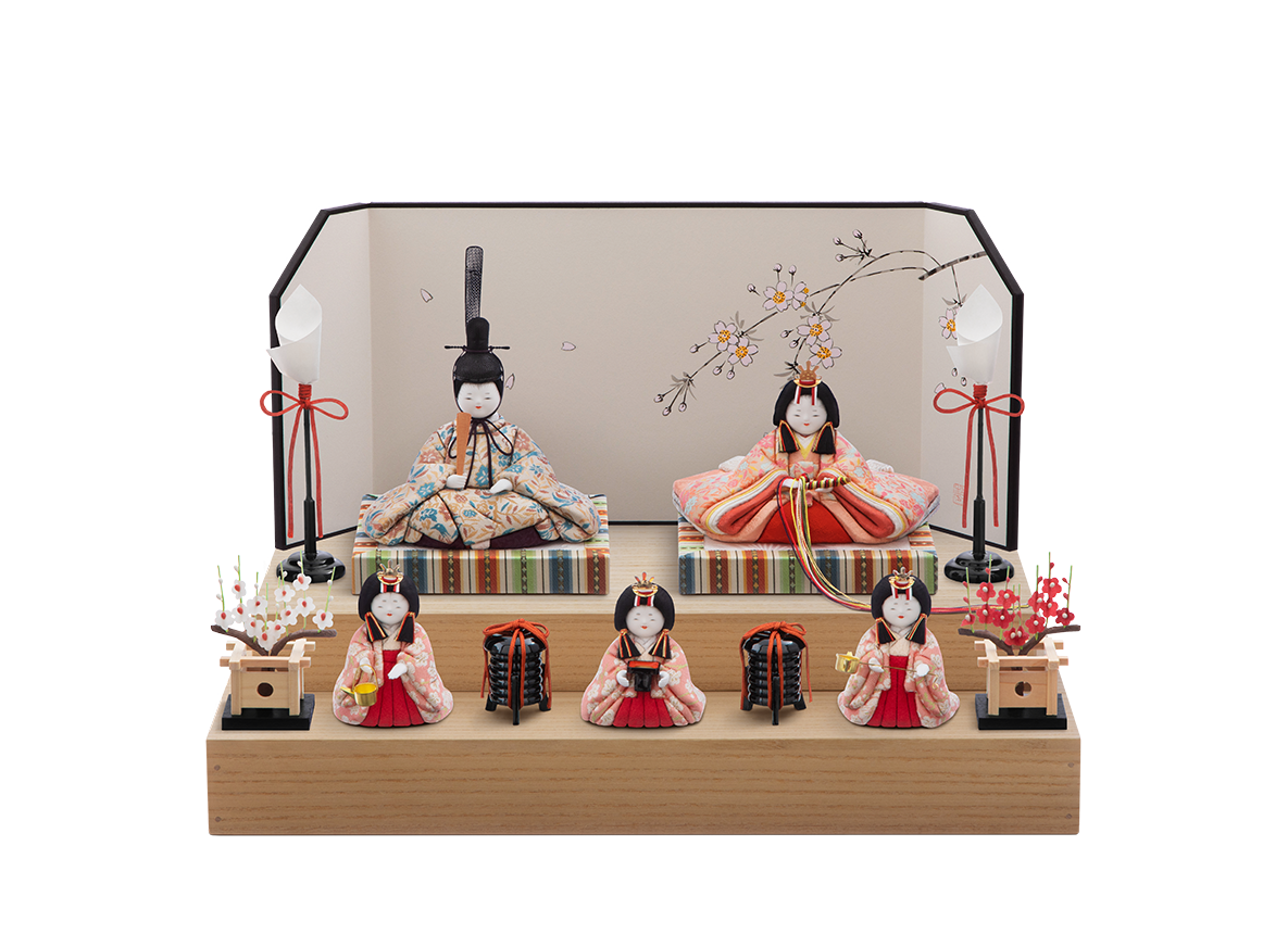 【金襴】飾り台やお屏風が選べる、コンパクトで飾りやすいHINAシリーズの雛人形です。お衣装の美しさや体の流れるような造形の美しさに見惚れてしまう五色・原孝洲の自信作で、三代続く木目込み人形作家の技術に裏打ちされた雛人形です。まず、体の造形の繊細さに魅力がつまっています。肩口から袂(たもと)、背中にかけて美しい曲線を描いており、写実味を得ながらも、それでいてどこかにお人形さんらしい丸みを帯び、絶妙なバランスが愛くるしさを生んでいます。お姫様の十二単を着重ねた際の、袖口と後背部の美しいグラデーションも見逃せません。同様にお殿様も後背部に下襲の裾(したがさねのきょ)と呼ばれる部分まで再現し伝統に則りながら、かつ、足を組んだ形などはかわいらしく、味わい深い作品になりました。お顔も体とのバランスに合わせ、上品で麗しい、しかしどこかに幼さを残した、五色・原孝洲独特であり、大切にしているお姿です。ふんわりと空気をまとったように贅沢に結われた髪型は、多くの絹糸を丁寧にまとめあげて仕上げており、額の生え際まで筆で丁寧に描きこむことで、特徴あるお顔がもつ優美さを引き立てます。お衣装はツヤを含んだ美しい西陣織で、貴人にふさわしい花鳥文様を殿姫へ仲睦まじく着せつけました。殿姫同様に、お子様の行く末頼もしい成長を見守る三人官女は、雛人形の華やかでいながら厳かな味わいを豊かにします。かわいいだけでは終わらない、伝えるべき大切な日本文化の美しさをこの場へ現出させてくれます。雛人形として欠かすことのできない三人官女も私たちのこだわりです。飾り方は段飾り上段に殿姫を、下段へ三人官女を並べます。段のお飾りにすることで立体的な美が強調されながらも、台の幅や奥行きがほぼ変わらない点も大変人気です。【蒔絵】こちらの作品は特にお衣装の出来栄えに目を惹かれます。豪華にも本金箔を使い、蒔絵の技法(手描きで衣装の上から直接描く)で絵柄を施しました。桃の節句の春らしい気分が嬉しい梅と、繁栄を示す松や竹の縁起柄をお衣装いっぱいに盛り込みました。お子様の門出に良い縁起をたくさん取り込んだ絵柄となっています。ご家族で集うお節句のお祝いにはきっとお雛様に注目が集まるはずです。