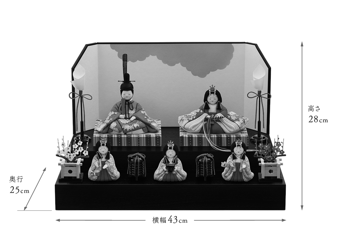 【金襴】飾り台やお屏風が選べる、コンパクトで飾りやすいHINAシリーズの雛人形です。お衣装の美しさや体の流れるような造形の美しさに見惚れてしまう五色・原孝洲の自信作で、三代続く木目込み人形作家の技術に裏打ちされた雛人形です。まず、体の造形の繊細さに魅力がつまっています。肩口から袂(たもと)、背中にかけて美しい曲線を描いており、写実味を得ながらも、それでいてどこかにお人形さんらしい丸みを帯び、絶妙なバランスが愛くるしさを生んでいます。お姫様の十二単を着重ねた際の、袖口と後背部の美しいグラデーションも見逃せません。同様にお殿様も後背部に下襲の裾(したがさねのきょ)と呼ばれる部分まで再現し伝統に則りながら、かつ、足を組んだ形などはかわいらしく、味わい深い作品になりました。お顔も体とのバランスに合わせ、上品で麗しい、しかしどこかに幼さを残した、五色・原孝洲独特であり、大切にしているお姿です。ふんわりと空気をまとったように贅沢に結われた髪型は、多くの絹糸を丁寧にまとめあげて仕上げており、額の生え際まで筆で丁寧に描きこむことで、特徴あるお顔がもつ優美さを引き立てます。お衣装はツヤを含んだ美しい西陣織で、貴人にふさわしい花鳥文様を殿姫へ仲睦まじく着せつけました。殿姫同様に、お子様の行く末頼もしい成長を見守る三人官女は、雛人形の華やかでいながら厳かな味わいを豊かにします。かわいいだけでは終わらない、伝えるべき大切な日本文化の美しさをこの場へ現出させてくれます。雛人形として欠かすことのできない三人官女も私たちのこだわりです。飾り方は段飾り上段に殿姫を、下段へ三人官女を並べます。段のお飾りにすることで立体的な美が強調されながらも、台の幅や奥行きがほぼ変わらない点も大変人気です。【蒔絵】こちらの作品は特にお衣装の出来栄えに目を惹かれます。豪華にも本金箔を使い、蒔絵の技法(手描きで衣装の上から直接描く)で絵柄を施しました。桃の節句の春らしい気分が嬉しい梅と、繁栄を示す松や竹の縁起柄をお衣装いっぱいに盛り込みました。お子様の門出に良い縁起をたくさん取り込んだ絵柄となっています。ご家族で集うお節句のお祝いにはきっとお雛様に注目が集まるはずです。