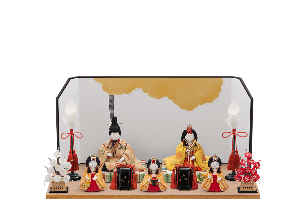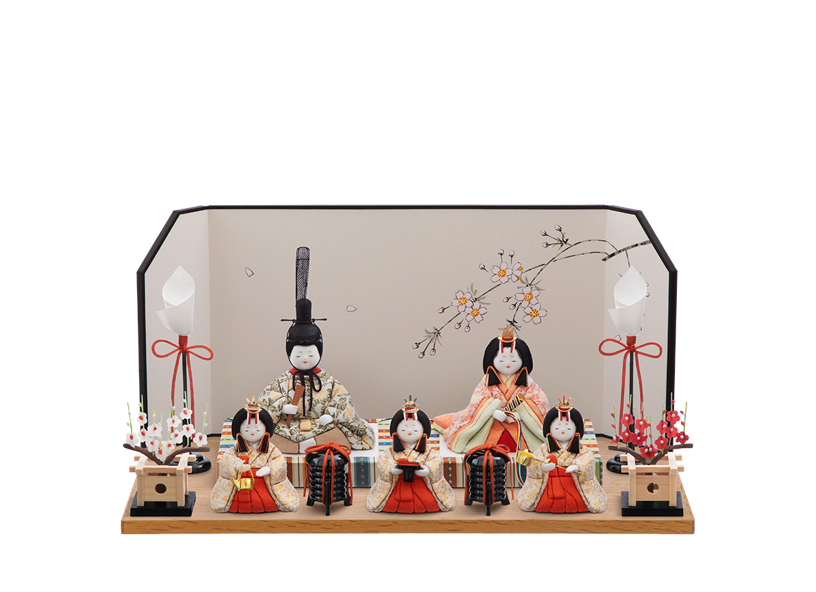【金襴】飾り台やお屏風が選べる、コンパクトで飾りやすいHINAシリーズの雛人形です。お衣装の美しさや体の流れるような造形の美しさに見惚れてしまう五色・原孝洲の自信作で、三代続く木目込み人形作家の技術に裏打ちされた雛人形です。まず、体の造形の繊細さに魅力がつまっています。肩口から袂(たもと)、背中にかけて美しい曲線を描いており、写実味を得ながらも、それでいてどこかにお人形さんらしい丸みを帯び、絶妙なバランスが愛くるしさを生んでいます。お姫様の十二単を着重ねた際の、袖口と後背部の美しいグラデーションも見逃せません。同様にお殿様も後背部に下襲の裾(したがさねのきょ)と呼ばれる部分まで再現し伝統に則りながら、かつ、足を組んだ形などはかわいらしく、味わい深い作品になりました。お顔も体とのバランスに合わせ、上品で麗しい、しかしどこかに幼さを残した、五色・原孝洲独特であり、大切にしているお姿です。ふんわりと空気をまとったように贅沢に結われた髪型は、多くの絹糸を丁寧にまとめあげて仕上げており、額の生え際まで筆で丁寧に描きこむことで、特徴あるお顔がもつ優美さを引き立てます。お衣装はツヤを含んだ美しい西陣織で、貴人にふさわしい花鳥文様を殿姫へ仲睦まじく着せつけました。殿姫同様に、お子様の行く末頼もしい成長を見守る三人官女は、雛人形の華やかでいながら厳かな味わいを豊かにします。かわいいだけでは終わらない、伝えるべき大切な日本文化の美しさをこの場へ現出させてくれます。雛人形として欠かすことのできない三人官女も私たちのこだわりです。収納にも困らないと好評の、組み立て不要の軽くて薄い平らな台に屏風をのせてお飾りするセットです。まさにハレの日にふさわしい雛人形です。【蒔絵】こちらの作品は特にお衣装の出来栄えに目を惹かれます。豪華にも本金箔を使い、蒔絵の技法(手描きで衣装の上から直接描く)で絵柄を施しました。桃の節句の春らしい気分が嬉しい梅と、繁栄を示す松や竹の縁起柄をお衣装いっぱいに盛り込みました。お子様の門出に良い縁起をたくさん取り込んだ絵柄となっています。ご家族で集うお節句のお祝いにはきっとお雛様に注目が集まるはずです。