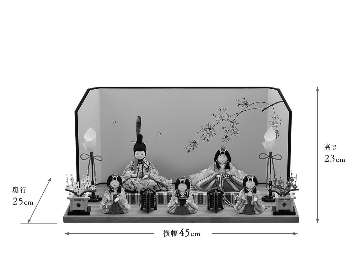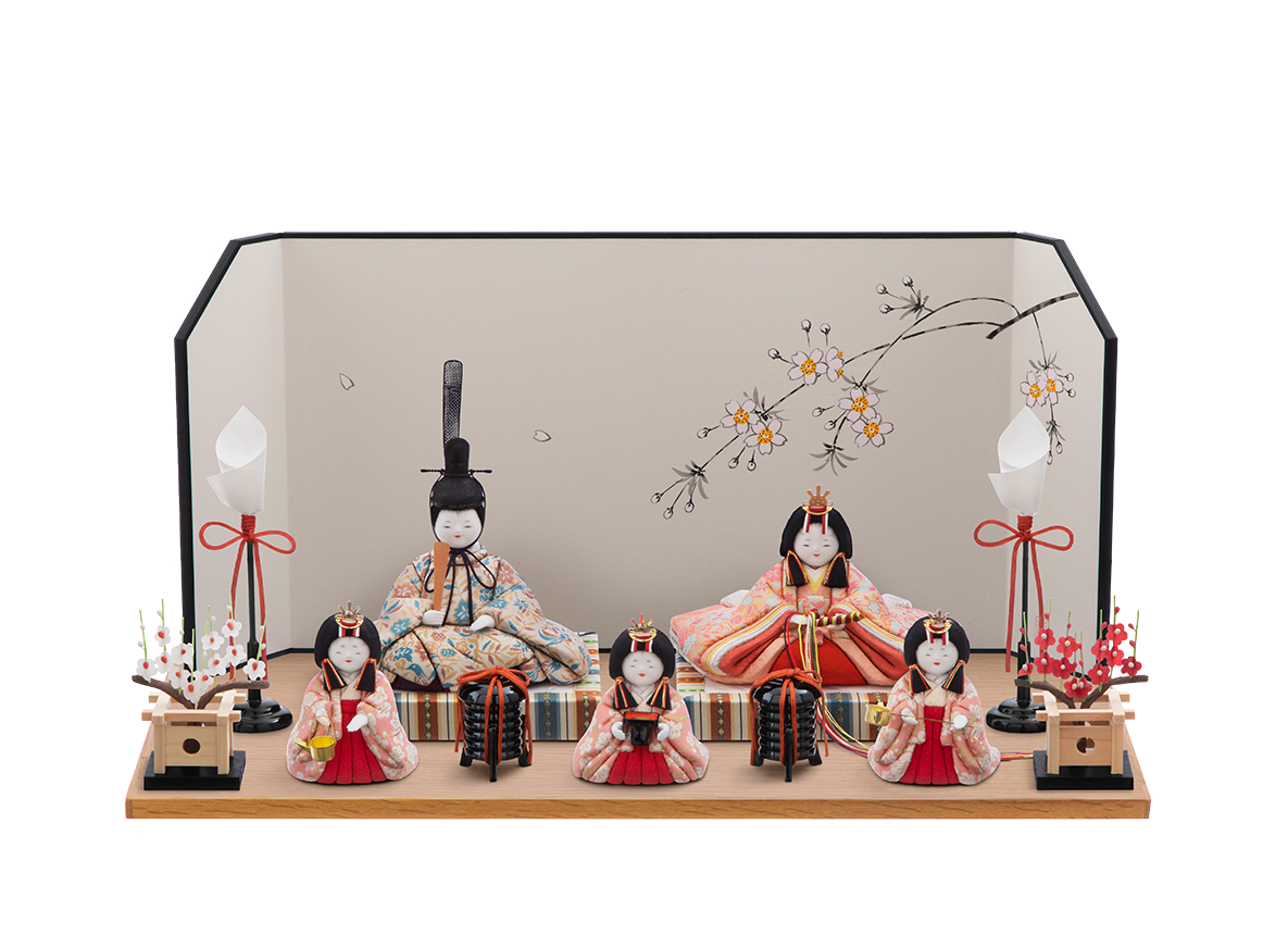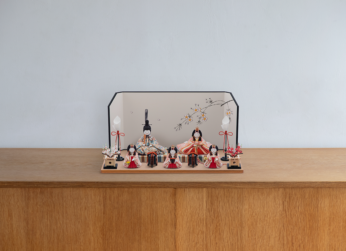 飾り台やお屏風が選べる、コンパクトで飾りやすいHINAシリーズの雛人形です。お衣装の美しさや体の流れるような造形の美しさに見惚れてしまう五色・原孝洲の自信作で、三代続く木目込み人形作家の技術に裏打ちされた雛人形です。まず、体の造形の繊細さに魅力がつまっています。肩口から袂(たもと)、背中にかけて美しい曲線を描いており、写実味を得ながらも、それでいてどこかにお人形さんらしい丸みを帯び、絶妙なバランスが愛くるしさを生んでいます。お姫様の十二単を着重ねた際の、袖口と後背部の美しいグラデーションも見逃せません。同様にお殿様も後背部に下襲の裾(したがさねのきょ)と呼ばれる部分まで再現し伝統に則りながら、かつ、足を組んだ形などはかわいらしく、味わい深い作品になりました。お顔も体とのバランスに合わせ、上品で麗しい、しかしどこかに幼さを残した、五色・原孝洲独特であり、大切にしているお姿です。ふんわりと空気をまとったように贅沢に結われた髪型は、多くの絹糸を丁寧にまとめあげて仕上げており、額の生え際まで筆で丁寧に描きこむことで、特徴あるお顔がもつ優美さを引き立てます。お衣装はツヤを含んだ美しい西陣織で、貴人にふさわしい花鳥文様を殿姫へ仲睦まじく着せつけました。殿姫同様に、お子様の行く末頼もしい成長を見守る三人官女は、雛人形の華やかでいながら厳かな味わいを豊かにします。かわいいだけでは終わらない、伝えるべき大切な日本文化の美しさをこの場へ現出させてくれます。雛人形として欠かすことのできない三人官女も私たちのこだわりです。収納にも困らないと好評の、組み立て不要の軽くて薄い平らな台に屏風をのせてお飾りするセットです。まさにハレの日にふさわしい雛人形です。