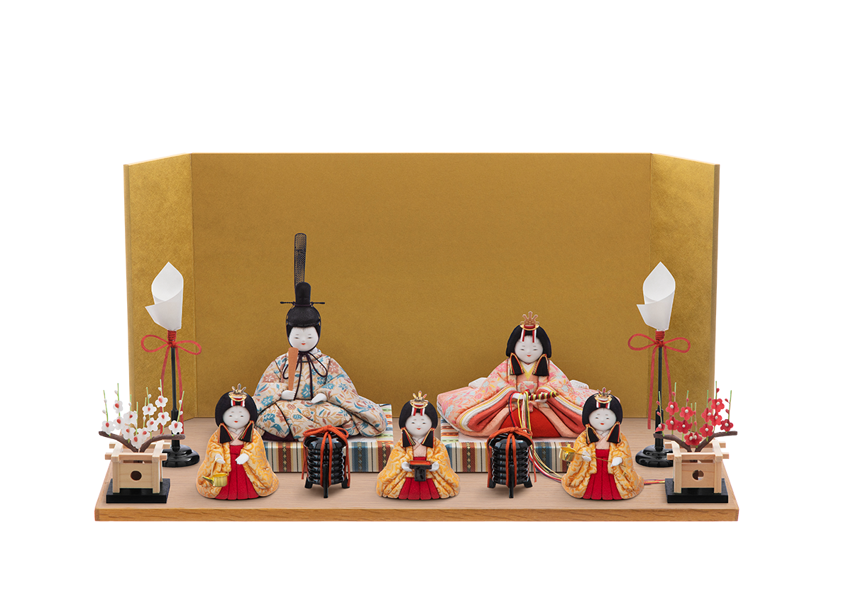 【金襴】飾り台やお屏風が選べる、コンパクトで飾りやすいHINAシリーズの雛人形です。お衣装の美しさや体の流れるような造形の美しさに見惚れてしまう五色・原孝洲の自信作で、三代続く木目込み人形作家の技術に裏打ちされた雛人形です。まず、体の造形の繊細さに魅力がつまっています。肩口から袂(たもと)、背中にかけて美しい曲線を描いており、写実味を得ながらも、それでいてどこかにお人形さんらしい丸みを帯び、絶妙なバランスが愛くるしさを生んでいます。お姫様の十二単を着重ねた際の、袖口と後背部の美しいグラデーションも見逃せません。同様にお殿様も後背部に下襲の裾(したがさねのきょ)と呼ばれる部分まで再現し伝統に則りながら、かつ、足を組んだ形などはかわいらしく、味わい深い作品になりました。お顔も体とのバランスに合わせ、上品で麗しい、しかしどこかに幼さを残した、五色・原孝洲独特であり、大切にしているお姿です。ふんわりと空気をまとったように贅沢に結われた髪型は、多くの絹糸を丁寧にまとめあげて仕上げており、額の生え際まで筆で丁寧に描きこむことで、特徴あるお顔がもつ優美さを引き立てます。お衣装はツヤを含んだ美しい西陣織で、貴人にふさわしい花鳥文様を殿姫へ仲睦まじく着せつけました。殿姫同様に、お子様の行く末頼もしい成長を見守る三人官女は、雛人形の華やかでいながら厳かな味わいを豊かにします。かわいいだけでは終わらない、伝えるべき大切な日本文化の美しさをこの場へ現出させてくれます。雛人形として欠かすことのできない三人官女も私たちのこだわりです。収納にも困らないと好評の、組み立て不要の軽くて薄い平らな台に屏風をのせてお飾りするセットです。まさにハレの日にふさわしい雛人形です。【蒔絵】こちらの作品は特にお衣装の出来栄えに目を惹かれます。豪華にも本金箔を使い、蒔絵の技法(手描きで衣装の上から直接描く)で絵柄を施しました。桃の節句の春らしい気分が嬉しい梅と、繁栄を示す松や竹の縁起柄をお衣装いっぱいに盛り込みました。お子様の門出に良い縁起をたくさん取り込んだ絵柄となっています。ご家族で集うお節句のお祝いにはきっとお雛様に注目が集まるはずです。