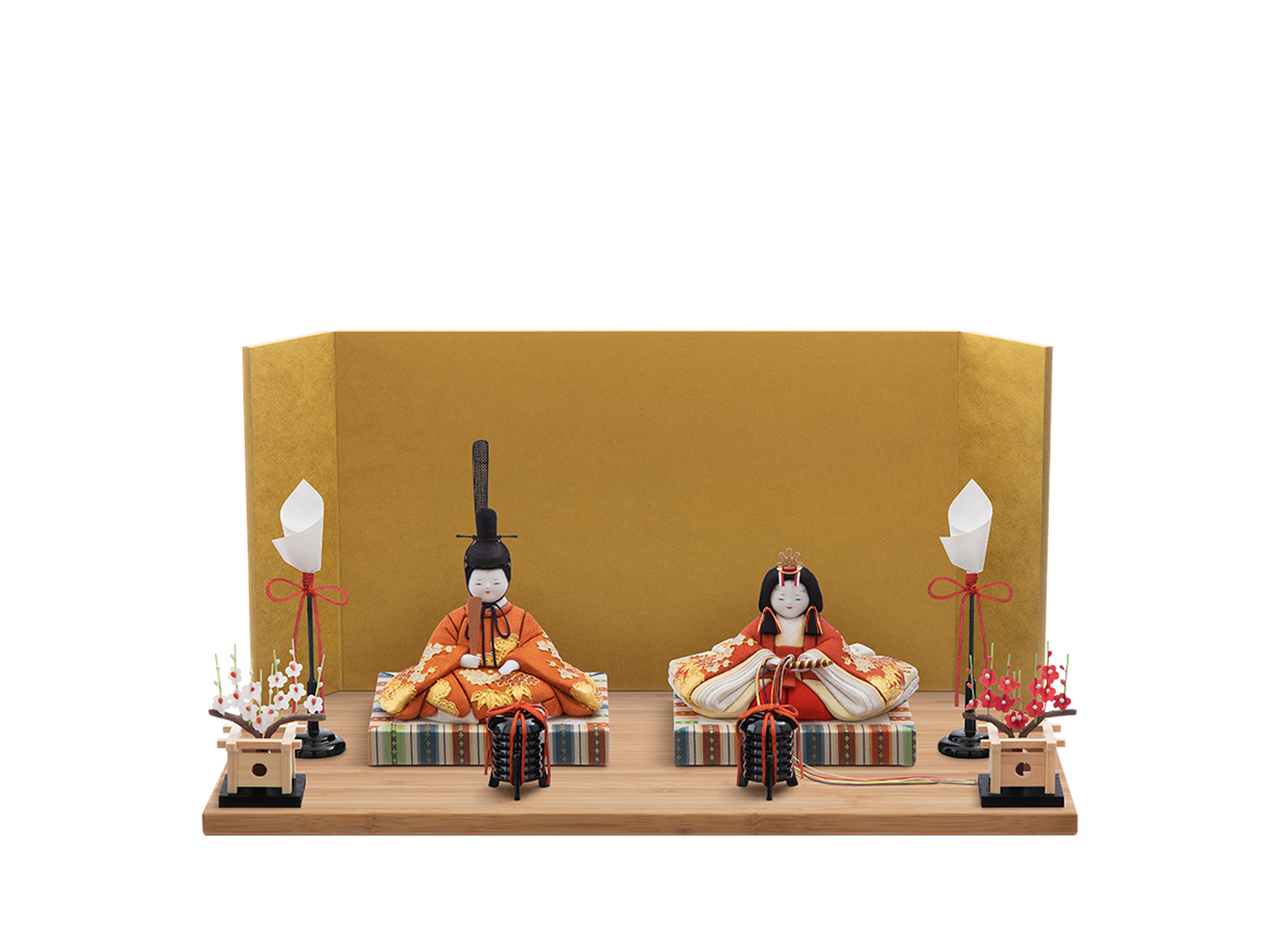 飾り台やお屏風が選べる、コンパクトシリーズの雛人形です。お衣装の美しさや体の流れるような造形の美しさに見惚れてしまう五色・原孝洲の自信作で、三代続く木目込み人形作家の技術に裏打ちされた雛人形です。まず、第一は造形の繊細さ。肩口から袂(たもと)、背中にかけて美しい曲線を描いており、写実味を得ながらも、それでいてどこかにお人形さんらしい丸みを帯び、絶妙なバランスが愛くるしさを生んでいます。お姫様の十二単を着重ねた際の、袖口と後背部の美しいグラデーションも見逃せません。同様にお殿様も後背部に下襲の裾(したがさねのきょ)と呼ばれる部分まで再現し伝統に則りながら、かつ、足を組んだ形などはかわいらしく、味わい深い作品になりました。お顔も体とのバランスに合わせ、上品で麗しい、しかしどこかに幼さを残した、五色・原孝洲独特であり、大切にしているお姿です。ふんわりと空気をまとったように贅沢に結われた髪型は、多くの絹糸を丁寧にまとめあげて仕上げており、額の生え際まで筆で丁寧に描きこむことで、特徴あるお顔がもつ優美さを引き立てます。特別な作品なので、金襴と蒔絵の2種類の衣装でご用意しました。省スペースで飾る場所を選ばない人気作です。