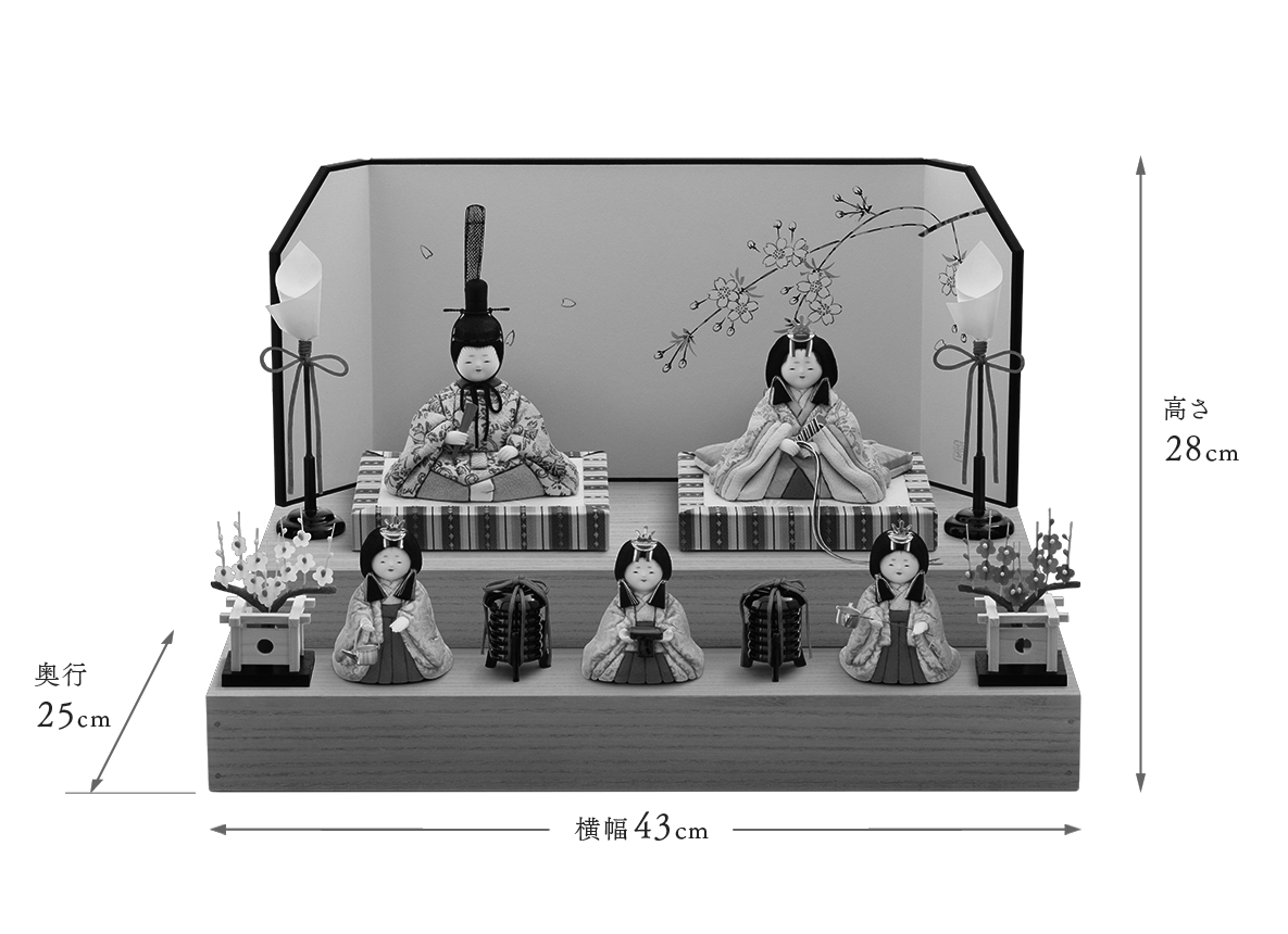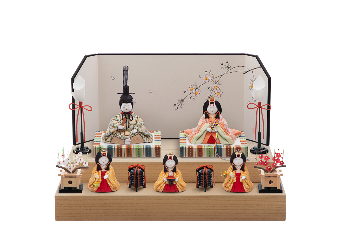 殿姫同様に、お子様の行く末頼もしい成長を見守る三人官女は、雛人形の華やかでいながら厳かな味わいを豊かにします。かわいいだけでは終わらない、伝えるべき大切な日本文化の美しさをこの場へ現出させてくれます。雛人形として欠かせない三人官女も私たちのこだわりです。飾り方は段飾り上段に殿姫を、下段へ三人官女を並べます。段のお飾りにすることで立体的な美が強調されながらも、コンパクトな点も大変人気です。