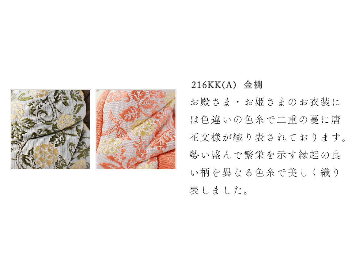 たて糸とよこ糸を組み合わせてつくる織物の一つ。色糸だけでなく、金糸あるいは平金箔をつかって織られた織物です。