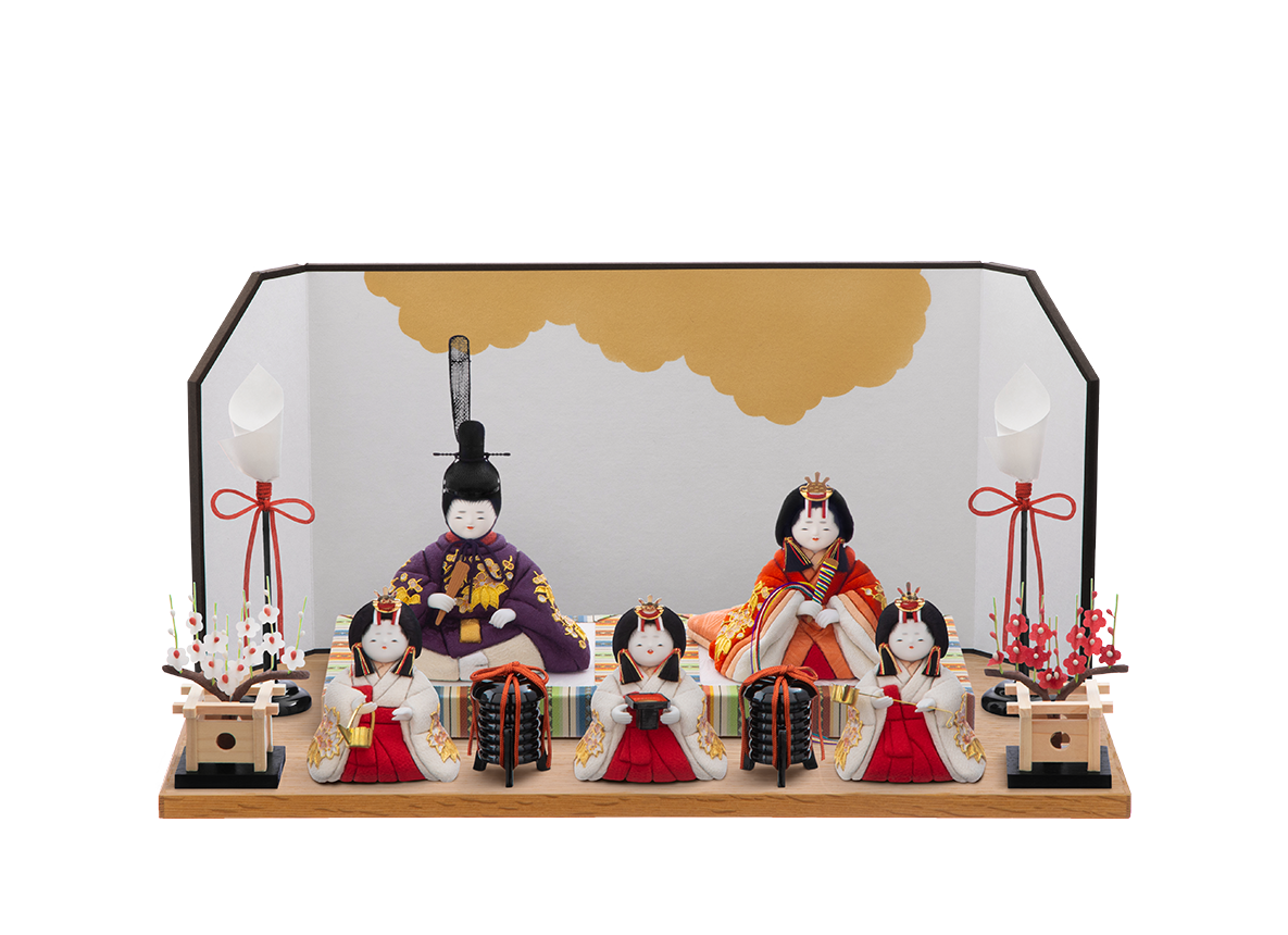 飾り台やお屏風が選べる、コンパクトで飾りやすいHINAシリーズの雛人形です。殿様・お姫様をお飾りしている台へ、一緒に三人官女まで並べられる五人飾りです。ほほえみをたたえた表情は様々な感情を呼び起こさせてくれます。赤ちゃんのもつ純真無垢な姿、また成長した上品な雰囲気をもただよわせており、これこそが五色・原孝洲の大切にする雛人形です。ふんわりと空気をまとったように贅沢に結われた髪型は、多くの絹糸を丁寧にまとめあげて仕上げており、額の生え際まで筆で丁寧に描きこむことで、特徴あるお顔がもつ優美さを引き立てます。お衣装は伝統的な美しい若草色(殿)と桜色(姫)の上に、豪華にも本金箔を使った蒔絵の技法(手描きで衣装の上から直接描く)で絵柄を施しました。春に先駆けて咲く梅と、繁栄を示す笹は取り合わせよい縁起柄として好まれます。お姫様の袖口や袴のグラデーションの美しさ、お殿様の後背部には下襲の裾(したがさねのきょ)と呼ばれる部分まで再現しており、実際に着物を召したようなお姿は、木目込み人形としての高い技術水準を示しています。殿姫同様に、お子様の行く末頼もしい成長を見守る三人官女は、雛人形の華やかでいながら厳かな味わいを豊かにします。かわいいだけでは終わらない、伝えるべき大切な日本文化の美しさをこの場へ現出させてくれます。雛人形として欠かすことのできない三人官女も私たちのこだわりです。組み立て不要の軽くて薄い平らな台と、上品なデザインの屏風でお飾りする雛人形です。末永くお飾りするお雛様。訪れる桃の節句が毎年楽しみになるような雛人形です。