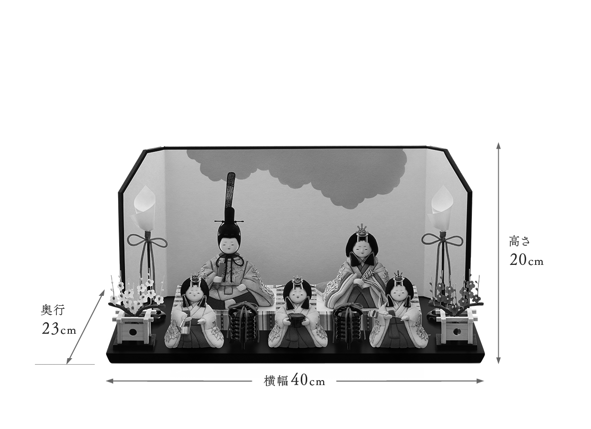 お人形やお道具などゆったりとお飾りいただける飾り台幅45cmの「竹」にご変更可能です。詳細はこちら⇒Topics「萌雛五人飾りの飾り台_竹につきまして」